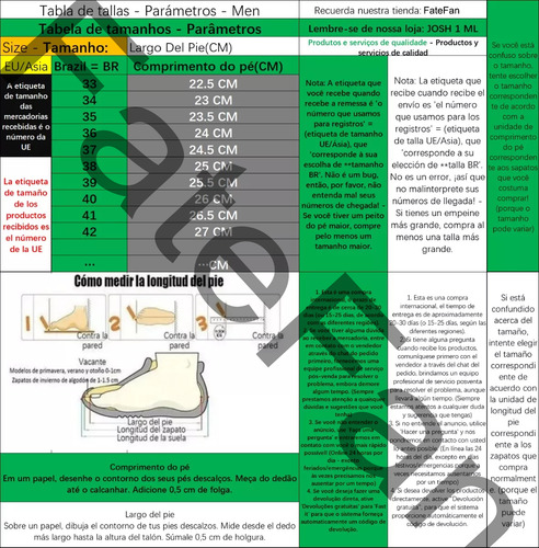 2. Os tamanhos deste anúncio são tamanhos asiáticos, que são especialmente projetados para tamanhos de calçados brasileiros. Você pode fazer um pedido de acordo com o tamanho que você usa no Brasil, e escolher o tamanho BR correspondente para fazer o pedido.