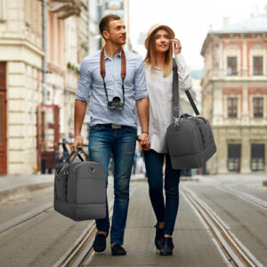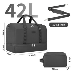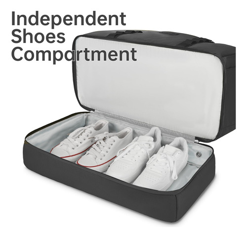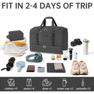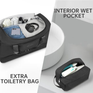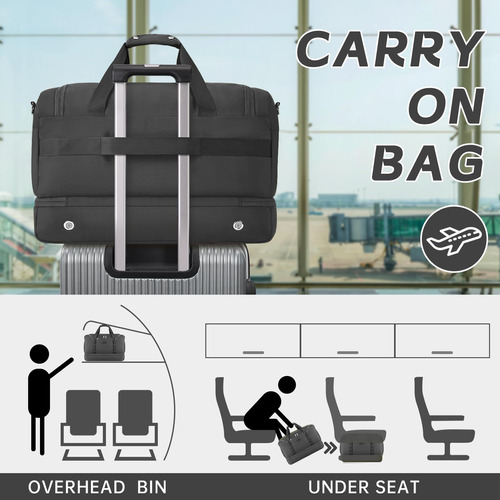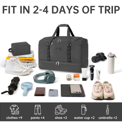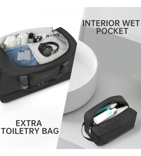 Mochila – grande capacidade e leve. A mochila tem 20,8 x 9 x 13,5 polegadas, a capacidade é de cerca de 42 litros e pode caber em uma viagem curta de 2 a 4 dias de itens essenciais diários. A bolsa de viagem é feita de tecido leve e resistente à água de alta qualidade. Pesa apenas 1,8 libras, é conveniente para viajar e transportar. – Separação seca e úmida. A bolsa de ginástica com um bolso forrado de PVC à prova d'água com zíper para roupas molhadas, toalhas e roupa de banho pode manter a bolsa limpa com eficácia e não se molhar. E a bolsa de higiene pode ser colocada em seus produtos de higiene pessoal, cosméticos, lâminas de barbear, etc. Fácil de guardar e organizar. – Compartimento separado para sapatos A bolsa de fim de semana tem uma cabine de sapatos independente, que pode acomodar 2 pares de sapatos masculinos ou roupas sujas e saídas de ar para dispersar o mau cheiro. Ela pode ajudar a evitar sujar outras roupas ao fazer as malas, além de proporcionar mais conveniência para sua viagem. – Design ideal para viagens A mala de mão está perfeitamente alinhada com os regulamentos de voo e os requisitos de bagagem de mão das principais companhias aéreas. Ela pode ser colocada na cabine da aeronave e embaixo do assento para facilitar a acessibilidade, e a manga traseira permite que você se prenda à mala e solte as mãos. – A bolsa de dormir versátil Se você estiver indo para a academia, planejando uma escapadela de fim de semana ou fazendo uma viagem de negócios, é ideal para diversos fins. Esta bolsa multiuso pode ser usada como bolsa de ginástica, bagagem de mão para voos, bolsa esportiva, bolsa de fim de semana, bolsa de hospital ou uma elegante companheira de praia.