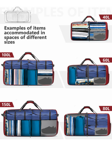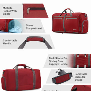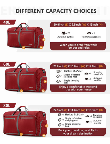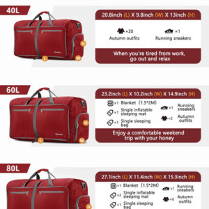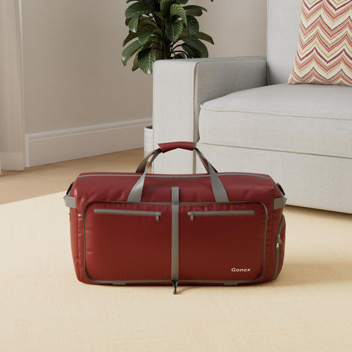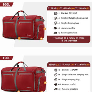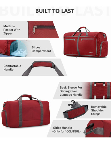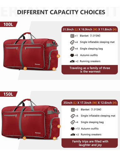 Mochila de viagem dobrável grande Gonex de 100 litros com compartimento para sapatos, mochila leve e repelente à água para acampar, academia, bolsa de fim de semana vermelha – mochila de viagem dobrável. Ela se estende até 31,9 x 16,9 x 11,8 polegadas com capacidade de 100 litros. O tamanho dobrado é 13,78 x 13 x 1,77 polegadas, facilitando o armazenamento. Pesa apenas 1,5 libras, pelo menos 80% menos que uma mala vazia, mas ainda oferece a mesma capacidade de armazenamento de uma mala – Design racional: esta mochila possui uma bolsa interna, compartimento para sapatos, vários bolsos, alça de ombro ajustável/removível e uma manga traseira para deslizar sobre as alças de bagagem. Os tamanhos de 100 L e 150 L incluem duas alças laterais, permitindo que duas pessoas os carreguem juntas para uma melhor experiência. – Construído para durar muito tempo. Feito de tecido de nylon 210D em forma de favo de mel, é à prova d'água e resistente ao desgaste. Zíperes de metal premium e principais pontos de estresse reforçados nunca falharão — multiuso. Sua companheira perfeita para viajar, ela também pode servir como bolsa de ginásia/esporte/pernoite/fim de semana/de compras/só para guardar. Perfeita para guardar a família ou precisar de bolsas hospitalares — cor vermelha, para força, paixão e amor