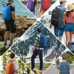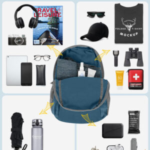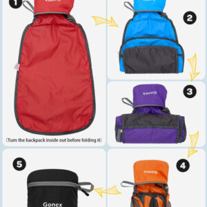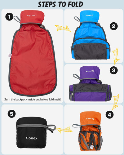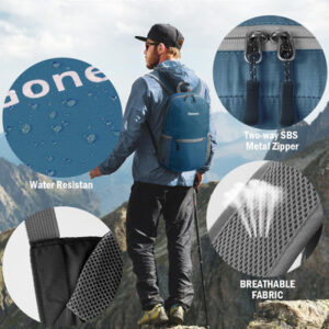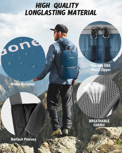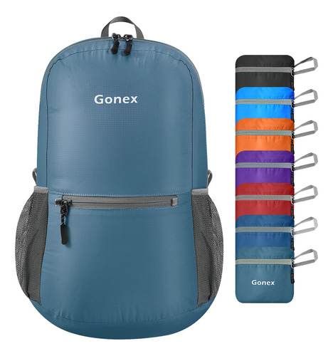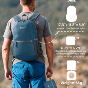 Mochila embalável Gonex Especificações da mochila de caminhada: Peso: 185 g Capacidade: 20 litros Tamanho compacto: 16 x 16 cm (A x L x P) Tamanho desdobrável: 44 x 30 x 15 cm (A x L x P) Características: Feito de material de náilon resistente à água e ao desgaste de alta qualidade, com zíper de metal SBS e processo bartack. O bolso principal é grande o suficiente para transportar o que você precisa. O bolso interno funciona como bolso interno. Alças de ombro de malha respirável. Suporte para garrafas nos dois lados. Fácil de ajustar o comprimento e trancar com firmeza. O bolso externo menor é ótimo para acesso rápido, como guias e câmera. Perfeito para viagens de um dia, férias, viagens, caminhadas diurnas, escola, acampamento e compras, etc. O pacote inclui: 1 mochila embalável Gonex Faixa etária recomendada: 3 ou mais – Companheira para atividades ao ar livre: perfeita para uma variedade de ocasiões, como viagens aéreas, volta às aulas, acampamento de verão e compras – Adequada para adultos/estudantes: desdobrada mede 17,3* 11,8* 5,9 polegadas e pesa apenas 185 g, o que a torna ideal para adultos, estudantes universitários e crianças (aviso de risco de asfixia: peças pequenas que não são para crianças menores de 3 anos) — Convenientes e embaláveis: fáceis de dobrar em um bolso pequeno (6,29* 6,29) polegada). Assim, você pode facilmente colocá-la em sua mala para usar no destino como uma bolsa extra para a viagem – Mochila leve de qualidade: feita de material de náilon resistente à água e ao desgaste, disponível com zíper de metal SBS durável e resistente à abrasão. Reforçou mais de 25 lugares com o processo Bartack — Mantenha as coisas organizadas: mochila de caminhada de 20 litros com três compartimentos com zíper. Um bolso principal espaçoso para seus itens essenciais, um bolso externo para itens de acesso rápido, como guias e câmeras, e um bolso interno seguro para objetos de valor como dinheiro, cartões e passaportes — Cor: azul cinza, para itens macios, elegantes e calmos
