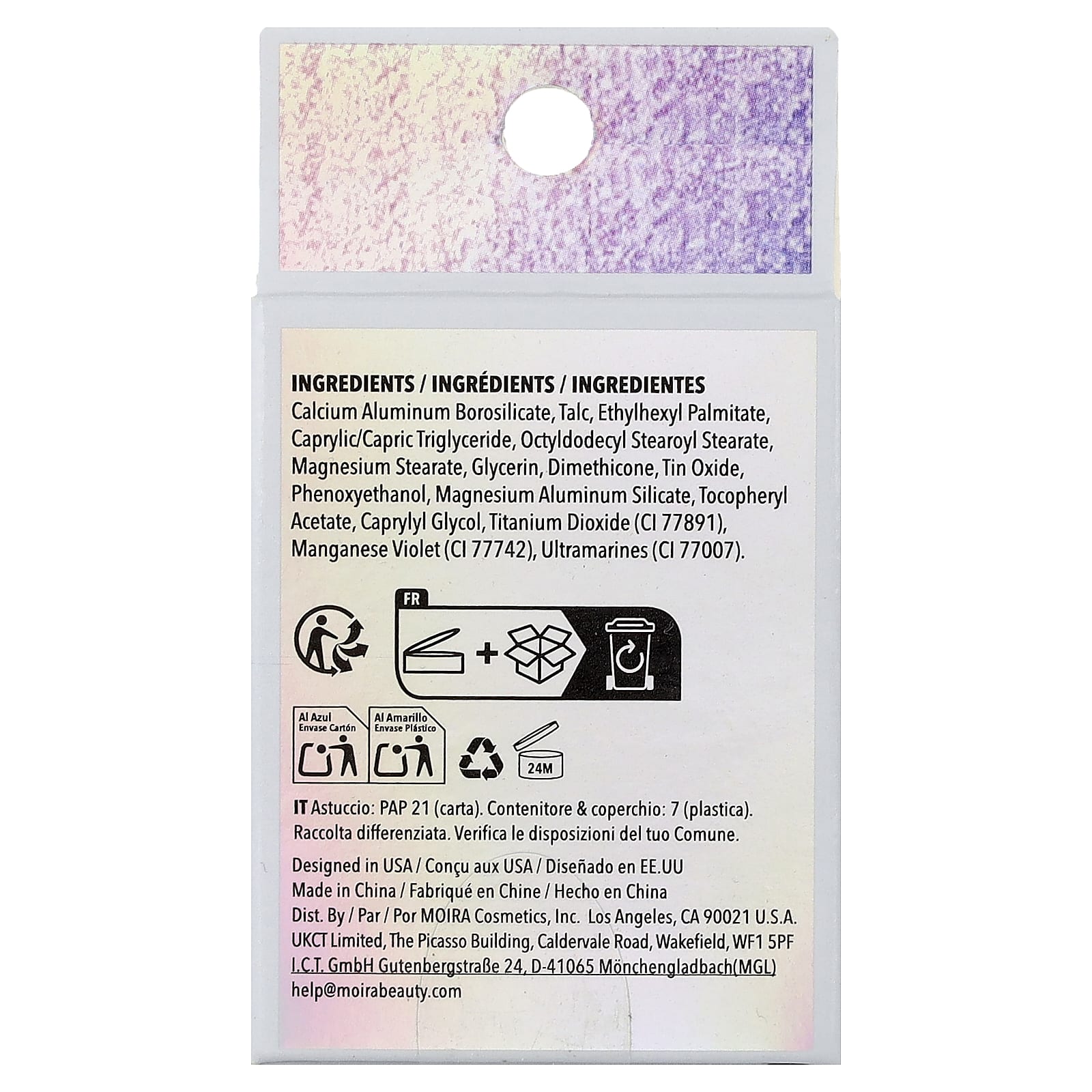 Borosilicato de alumínio de cálcio, talco, ethylhexyl palmitate, caprylic/capric triglyceride, octyldodecyl stearoyl stearate, estearato de magnésio, glicerina, dimeticona, óxido de estanho, fenoxietanol, silicato de alumínio e magnésio, acetato de tocoferol, caprylyl glycol, dióxido de titânio (CI 77891), manganese violet (CI 77742), ultramarinos (CI 77007).