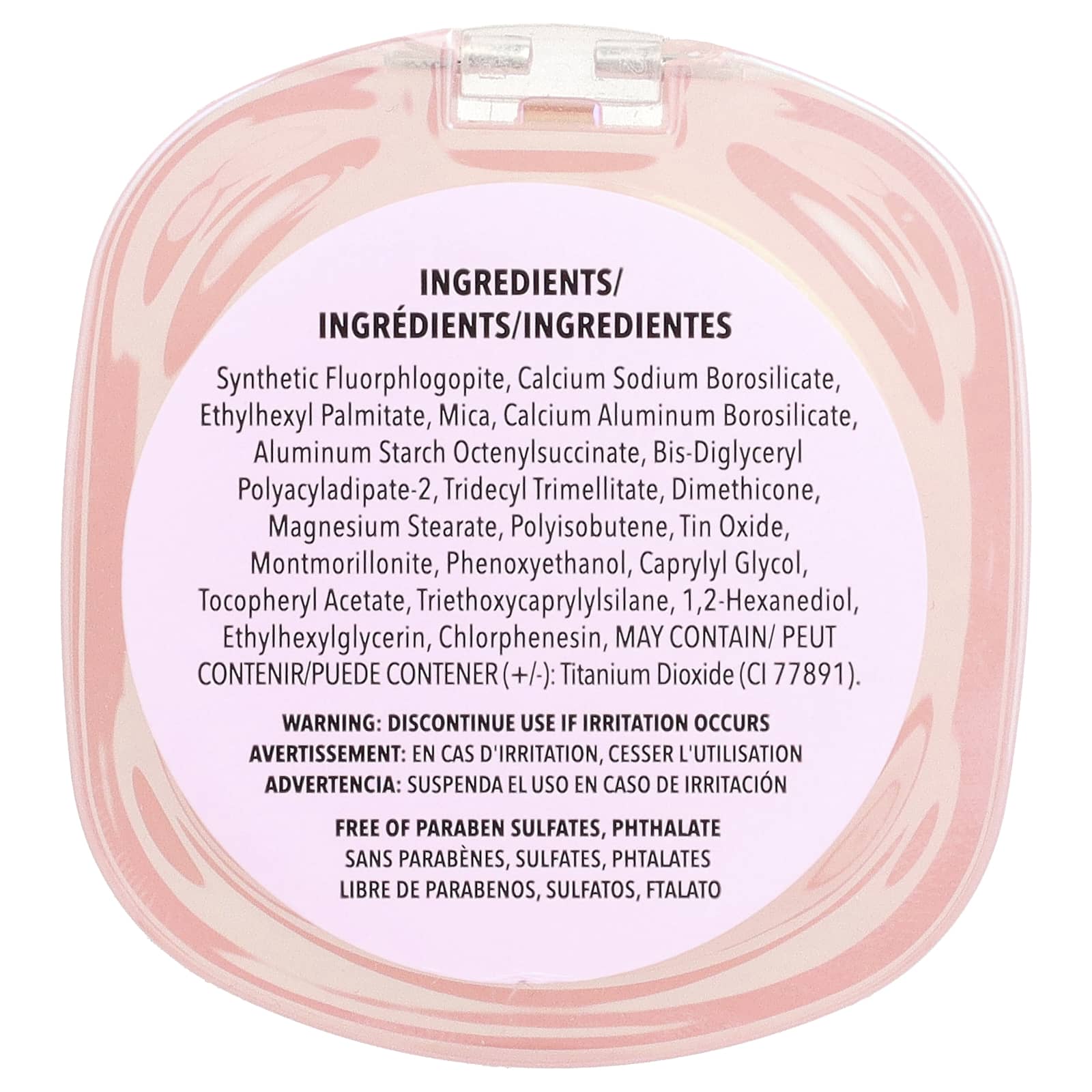 Synthetic fluorphlogopite, calcium sodium borosilicate, ethylhexyl palmitate, mica, calcium aluminum borosilicate, amidoctenilsuccinato de alumínio, bis-diglyceryl polyacyladipate-2, tridecyl trimellitate, dimeticona, estearato de magnésio, poli-isobutileno, óxido de estanho, montmorillonite, fenoxietanol, caprylyl glycol, acetato de tocoferol, triethoxycaprylylsilane, 1,2-hexanediol, ethylhexylglycerin, clorfenesina, Pode conter (+/-): dióxido de titânio (CI 77891).