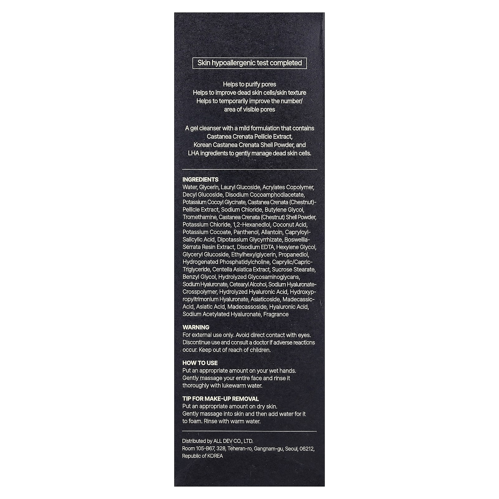 Um gel de limpeza com uma formulação suave que contém Extrato do Película de Castanea crenata, Pó da Casca de Castanea Crenata Coreana e ingredientes LHA para controlar suavemente as células mortas da pele.