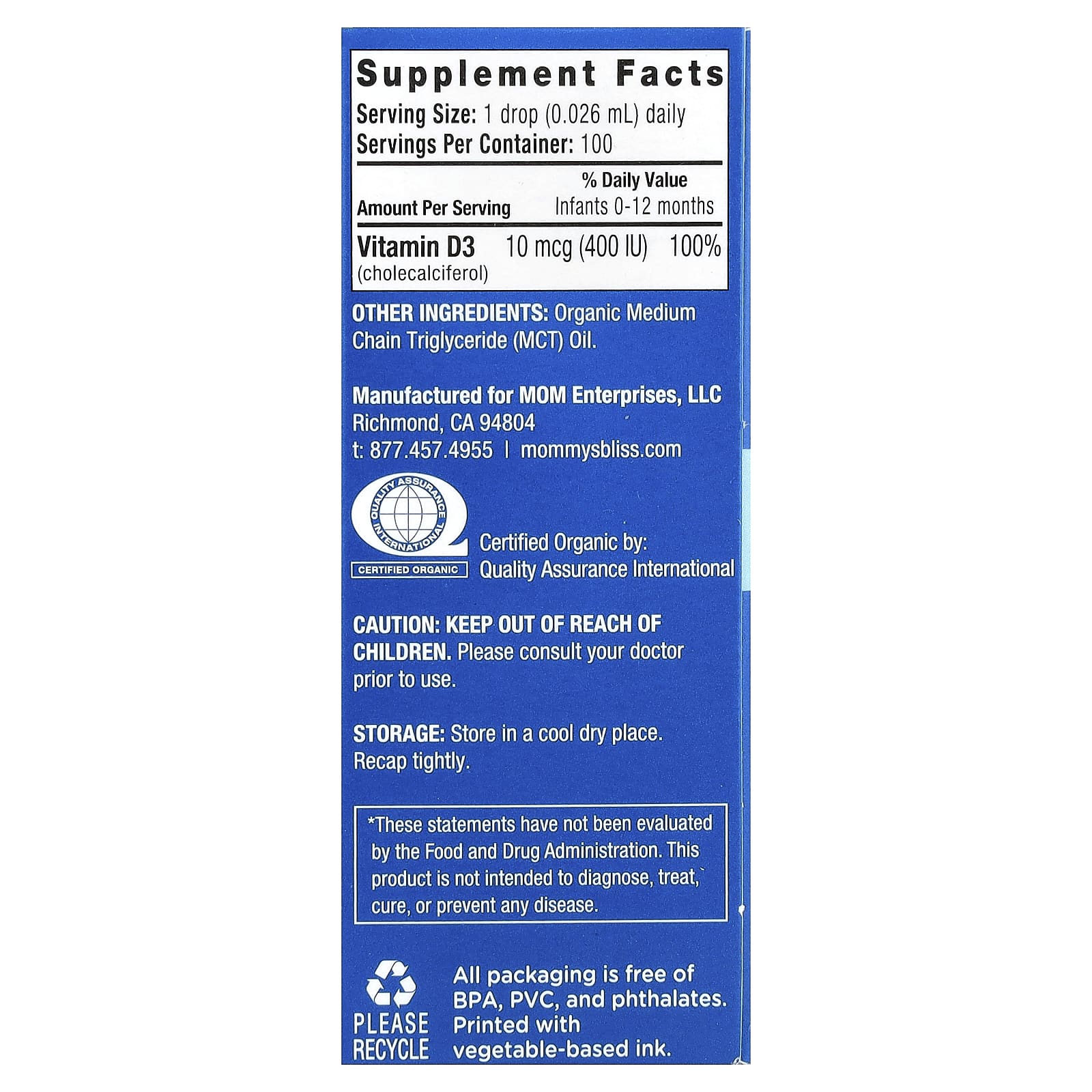 Mommys Bliss Vitamina D Orgânica em Gotas para Bebês A partir de Recém-nascido 324 ml (011 fl oz) – Mommy’s Bliss Bebês e Crianças Saúde Infantil Vitaminas para Crianças Vitamina D para Crianças.