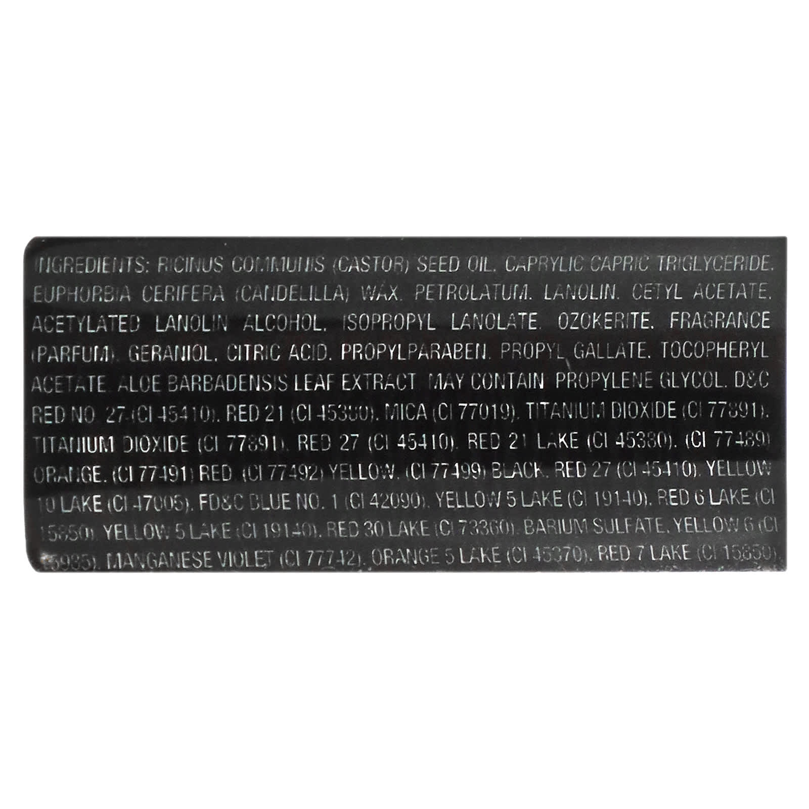 Óleo de semente de Ricinus communis (rícino), caprylic/capric triglyceride, cera de Euphorbia cerifera (candelila), petrolato, lanolina, cetyl acetate, álcool de lanolina acetilado, lanolato de isopropila, ozokerite, fragrância, geraniol, ácido cítrico, propilparabeno, galato de propila, acetato de racealfatocoferol, extrato da folha de Aloe barbadensis. Pode conter: Propilenoglicol, vermelho d & amp; c no.27 (CI 45410), vermelho 21 (ci 45380), mica (CI 77019), dióxido de titânio (CI 77891)*, vermelho 27 (ci 45410), vermelho 21 lago (ci 45380), (ci 77489) laranja, (ci 77491) vermelho, (ci 77492) amarelo, (ci 77499) preto, vermelho 27 (ci 45410), amarelo de quinolína (CI 47005), fd e c blue no.1 (CI 42090), tartrazina laca de alumínio (CI 19140), red 6 lake (CI 15850), tartrazina laca de alumínio (CI 19140), 30 laca vermelha (CI 73360), sulfato de bário, amarelo crepúsculo (CI 15985), manganese violet (CI 77742), laranja 5 lago (CI 45370), vermelho 7 lake (CI 15850).