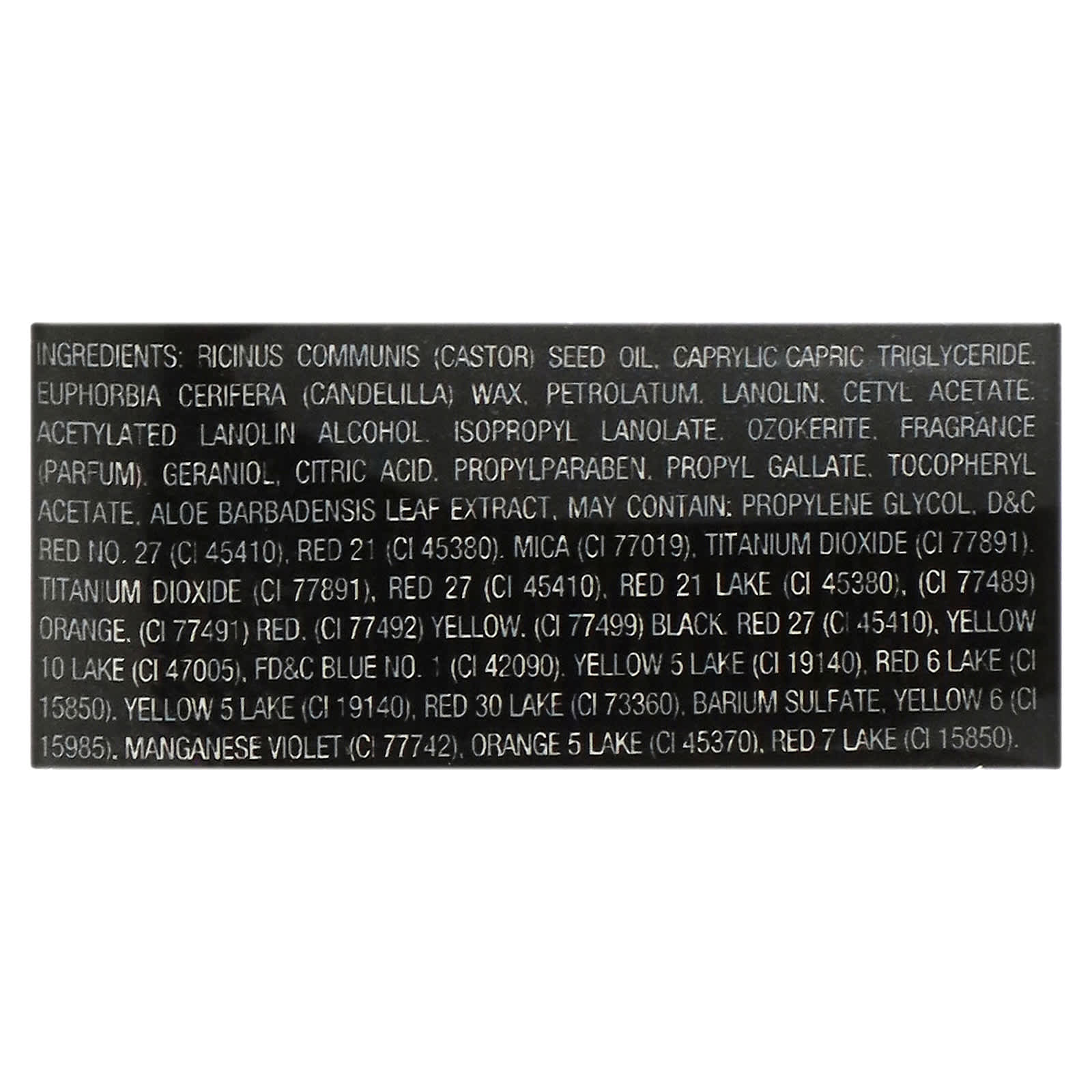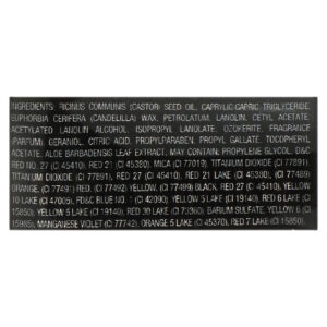 Óleo da semente de Ricinus communis (rícino), triglicerídeo de ácido cáprico/caprílico, cera de Euphorbia cerifera (candelilla), petrolato, lanolina, acetato de cetila, álcool de lanolina acetilado, isopropil-lanolato, ozocerita, fragrância, geraniol, ácido cítrico, propilparabeno, propil galato, acetato de tocoferol, extrato da folha de Aloe barbadensis. Pode conter: propilenoglicol, vermelho 27 (ci 45410), vermelho 21 (ci 45380), mica (ci 77019), dióxido de titânio (ci 77891), vermelho 27 (ci 45410), vermelho eosina laca de alumínio (ci 45380), (ci 77489) laranja, (ci 77491) vermelho, (ci 77492) amarelo, (ci 77499) preto, vermelho 27 (ci 45410), amarelo 10 (ci 47005), azul brilhante (ci 42090), tartrazina laca de alumínio (ci 19140), vermelho rubi laca de alumíno (ci 15850), tartrazina laca de alumínio (ci 19140), vermelho 30 laca de alumínio (ci 73360), sulfato de bário, amarelo crepúsculo (ci 15985), violeta manganês (ci 77742), laranja solar (ci 45370), vermelho 7 laca de cálcio (ci 15850).