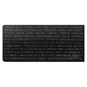 Óleo de semente de Ricinus communis (rícino), caprylic/capric triglyceride, cera de Euphorbia cerifera (candelila), petrolato, lanolina, acetato cetílico, álcool de lanolina acetilado, lanolato de isopropila, ozokerite, fragrância, geraniol, ácido cítrico, propilparabeno, galato de propila, acetato de racealfatocoferol, extrato da folha de Aloe barbadensis. Pode conter: Propilenoglicol, vermelho d & amp; c no.27 (CI 45410), vermelho 21 (ci 45380), mica (CI 77019), dióxido de titânio (CI 77891)*, vermelho 27 (ci 45410), vermelho 21 lago (ci 45380), (ci 77489) laranja, (ci 77491) vermelho, (ci 77492) amarelo, (ci 77499) preto, vermelho 27 (ci 45410), amarelo 10 (CI 47005), fd e c blue no.1 (CI 42090), tartrazina laca de alumínio (CI 19140), red 6 lake (CI 15850), tartrazina laca de alumínio (CI 19140), 30 laca vermelha (CI 73360), sulfato de bário, amarelo crepúsculo (CI 15985), manganese violet (CI 77742), laranja 5 lago (CI 45370), vermelho 7 lake (CI 15850).