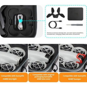 O pacote pode armazenar corpo neo, bateria de mordomo, 4 baterias (incluindo 1 no corpo e 3 no mordomo), bastão de controle cruzado 3, óculos de vôo N3, bem como filtros Sunnylife, hélices sobressalentes, chaves de fenda, cabos de carregamento e. outros acessórios.
