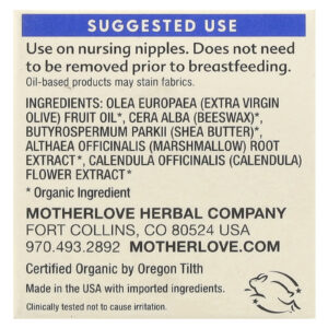 O Creme para Mamilos orgânico da Motherlove fornece alívio para os mamilos doloridos para ajudá-la a atingir seus objetivos de amamentação. O Creme para Mamilos não contém lanolina e é à base de plantas, com ervas calmantes de calêndula e raiz de marshmallow.