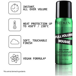 Mousse Redken Full Volume | Para todos os tipos de cabelo | Mousse volumizante para cabelos | Adiciona o máximo de corpo e sustentação aos comprimentos e pontas | Hidrata o cabelo e protege contra calor e danos | Controle médio | 2 onças – Mousse volumizante para volume total do cabelo com acabamento macio – Com polímeros volumizantes para aumentar a elasticidade e o corpo – Aplique mousse nos cabelos secos com toalha e seque com secador de cabelo para obter o máximo volume