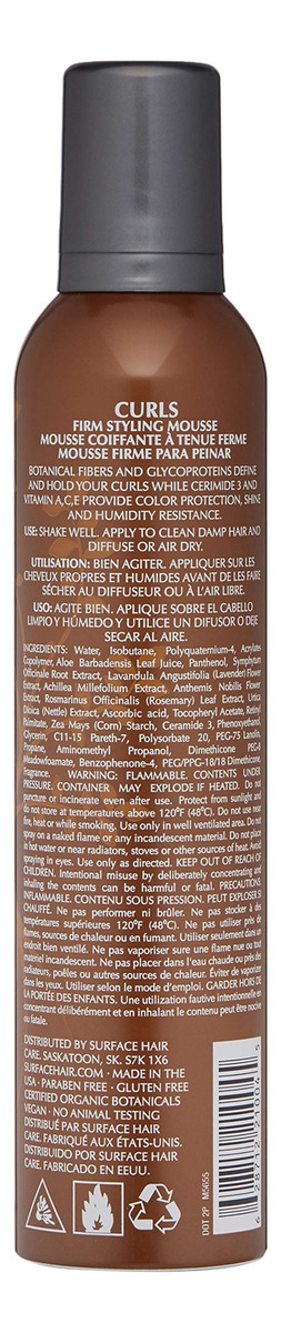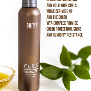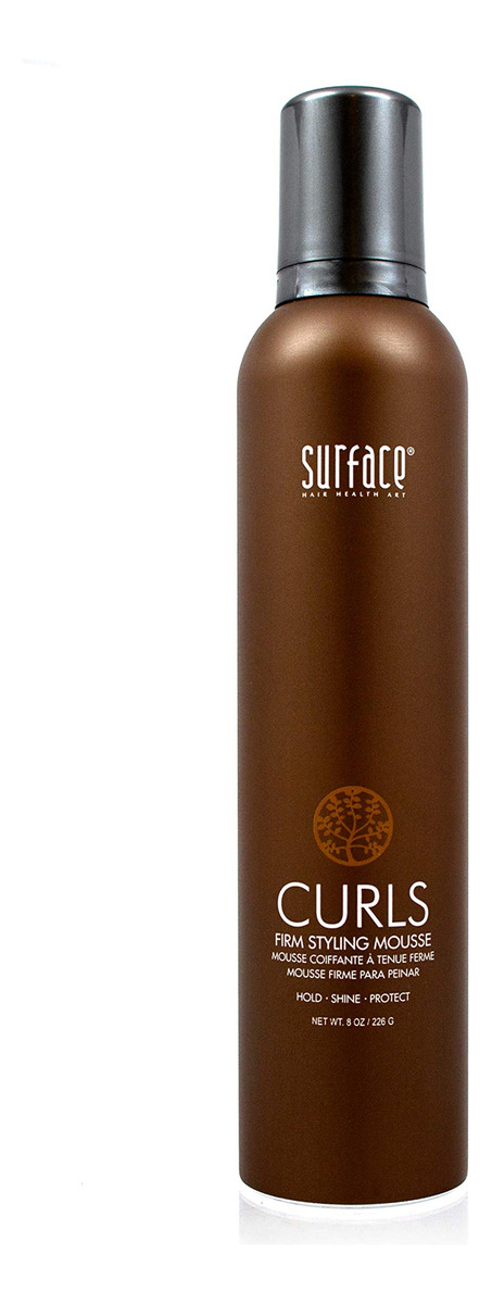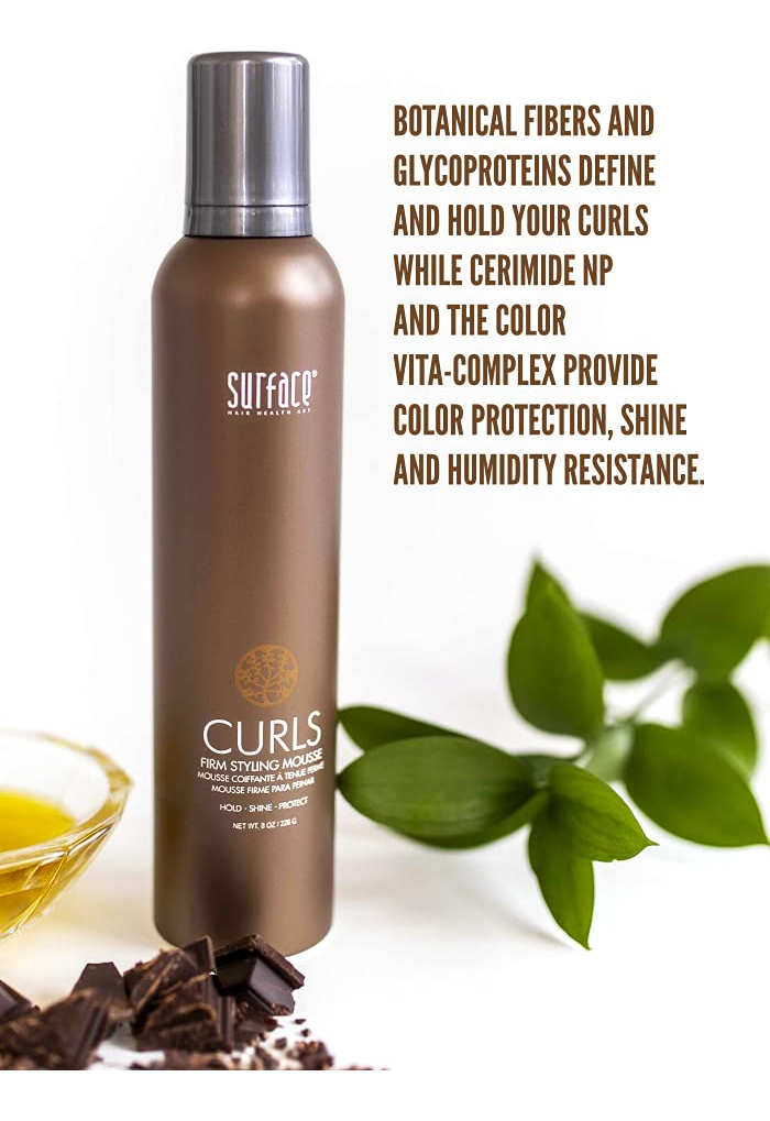 Mousse modeladora firme Surface Hair Curls, 8 onças — Mousse modeladora firme. — Perfeita para cabelos encaracolados e ondulados. — Fibras definidoras. Espere. Brilho. Proteja. – Resistente à umidade. – Proteção de cores.