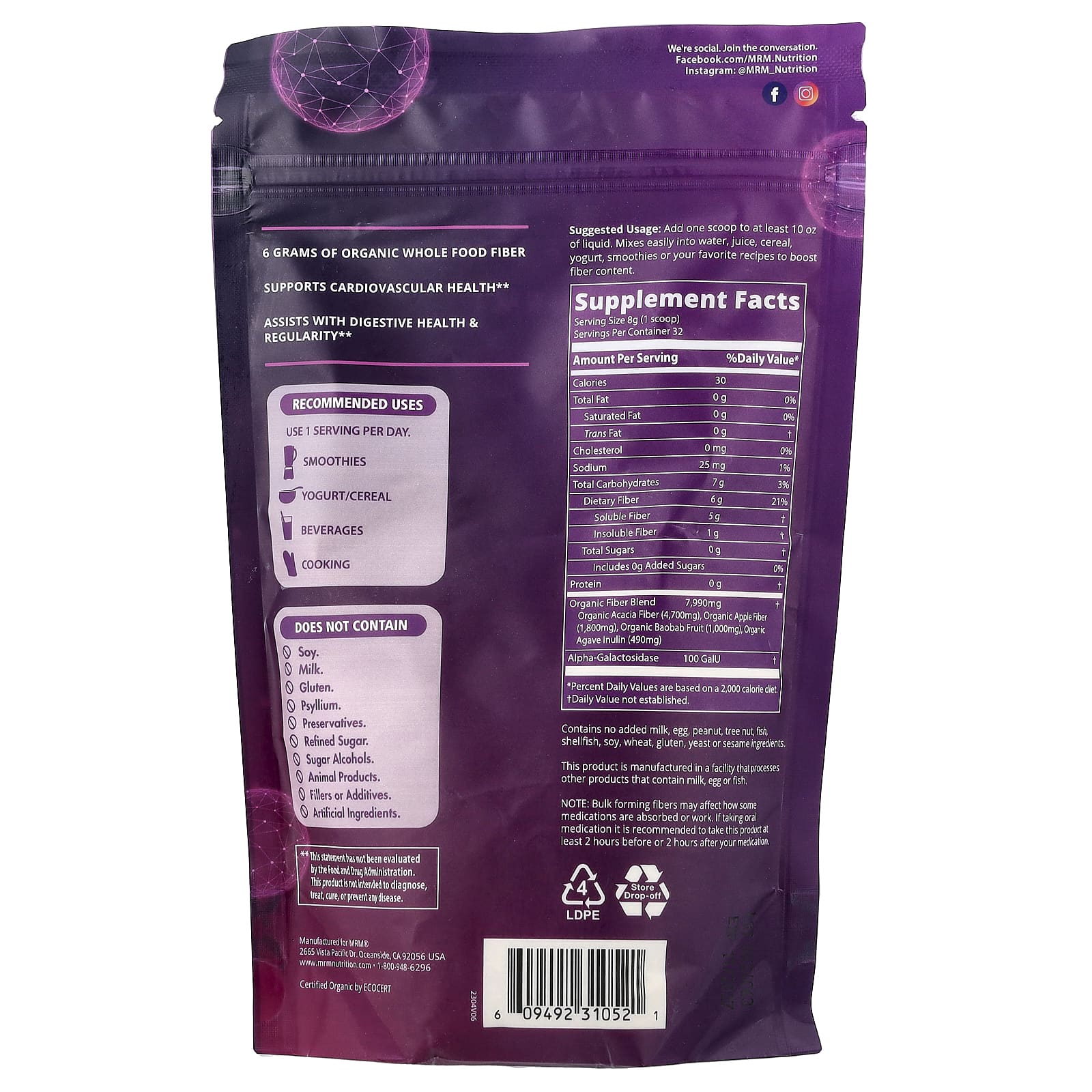 MRM Nutrition Alimento Integral Fibra Orgânica com Enzimas e Prebióticos 256 g (93 oz) – MRM Nutrition Suplementos Saúde Intestinal Fibras Misturas de Fibras Inulina e Fibras Prebióticas.