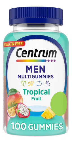 Gomas multivitamínicas masculinas Centrum, sabores de frutas tropicais feitos com sabores naturais, 100 unidades, suprimento para 50 dias — Frasco de 100 unidades de deliciosas gomas multivitamínicas masculinas Centrum com sabor de frutas tropicais para suporte imunológico, energia, metabolismo e função muscular (1) – Multivitaminas masculinas com vitaminas B para atender às necessidades diárias de energia e auxiliar no metabolismo (1) – Multivitaminas Centrum com vitaminas C e E para suporte imunológico (1) – Um delicioso multivitamínico gomoso com sabor de frutas feito sem xarope de milho com alto teor de frutose, corantes sintéticos ou sabores ou adoçantes artificiais – Goma multivitamínica vegetariana sem gelatina, sem glúten e sem glúten – As gomas multivitamínicas masculinas vêm nos sabores abacaxi, manga, fruta do dragão e maracujá – a Centrum tem o apoio da ciência há mais de 40 anos para fornecer suplementos nos quais você pode confiar
