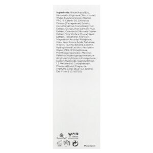 Água/aqua/eau, água de Hamamelis virginiana (hamamélis), butilenoglicol, álcool, ppg-5-ceteth-20, extrato de Chondrus crispus (carragenina), extrato do fruto de Cucumis sativus (pepino), extrato da fruta Citrus limon (limão-siciliano), extrato da flor de Calendula officinalis, extrato da semente de Vitis vinifera (uva), tocoferol, alantoína, magnesium ascorbyl phosphate, ureia, aminoácidos de levedura, trealose, inositol, taurina, betaína, lecitina, lecitina hidrogenada, pentilenoglicol, peg-12 dimeticona, menthoxypropanediol, mentol, palmitoyl hydroxypropyltrimonium amylopectin/glycerin crosspolymer, hidróxido de sódio, caprylyl glycol, 1,2-hexanediol, clorfenesina, fenoxietanol, fragrância (perfume), citral, azul brilhante (CI 42090), ext. violeta 2 (CI 60730).