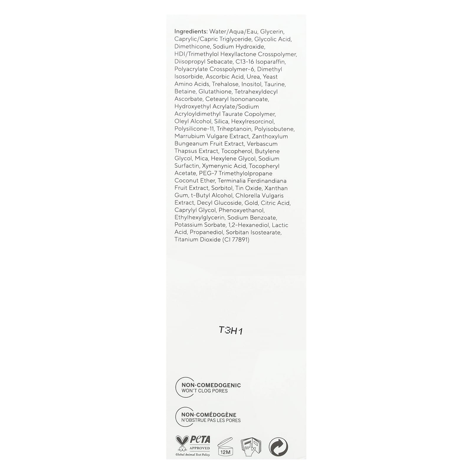 Água/aqua/eau, glicerina, caprylic/capric triglyceride, ácido glicólico, dimeticona, hidróxido de sódio, hdi/trimethylol hexyllactone crosspolymer, diisopropyl sebacate, isoparafina c13-16, polyacrylate crosspolymer-6, dimetil isossorbida, ácido ascórbico, ureia, aminoácidos de levedura, trealose, inositol, taurina, betaína, glutationa, tetrahexidecil ascorbato, cetearyl isononanoate, copolímero de acriloildimetiltaurato de sódio e acrilato de hidroxietila, álcool oleílico, sílica, hexilresorcinol, polissilicone-11, triheptanoin, poli-isobutileno, extrato de Marrubium vulgare, extrato da fruta de Zanthoxylum bungeanum, extrato de Verbascum thapsus, tocoferol, butilenoglicol, mica, hexylene glycol, surfactina de sódio, ácido ximenínico, acetato de tocoferol, éter de coco peg-7 trimetilolpropano, extrato da fruta de Terminalia ferdinandiana, sorbitol, óxido de estanho, goma xantana, terc-butanol, extrato de Chlorella vulgaris, decyl glucoside, ouro, ácido cítrico, caprylyl glycol, fenoxietanol, ethylhexylglycerin, benzoato de sódio, sorbato de potássio, 1,2-hexanediol, ácido láctico, propanediol, isoestearato de sorbitana, dióxido de titânio (CI 77891).