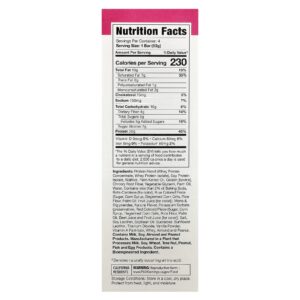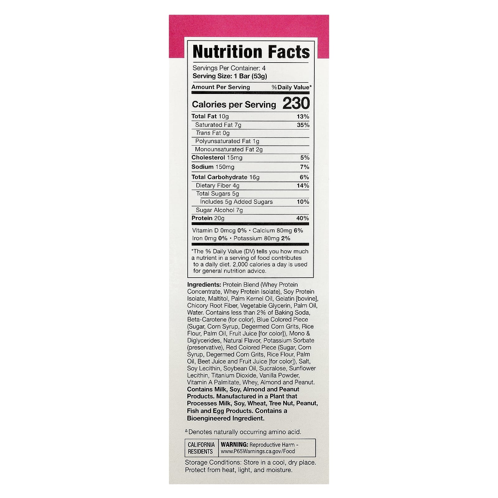 Mistura de proteínas (concentrado de proteína whey, isolado de whey protein), isolado proteico de soja, maltitol, óleo de palmiste, gelatina [bovina], fibra da raiz de chicória, glicerina vegetal, óleo de palma, água. contém menos de 2% de bicarbonato de sódio, betacaroteno (para dar cor), pedaços de cor azul (açúcar, xarope de milho, grãos de milho degerminados, farinha de arroz, óleo de palma, suco de frutas [para dar cor]), mono e diglicerídeos, sabor natural, sorbato de potássio (conservante), pedaços de cor vermelha (açúcar, xarope de milho, grãos de milho degerminados, farinha de arroz, óleo de palma, suco de beterraba e suco de frutas [para dar cor]), sal, lecitina de soja, óleo de soja, sucralose, lecitina de girassol, dióxido de titânio, baunilha em pó, vitamina A (palmitato), whey, amêndoa e amendoim.