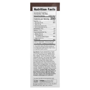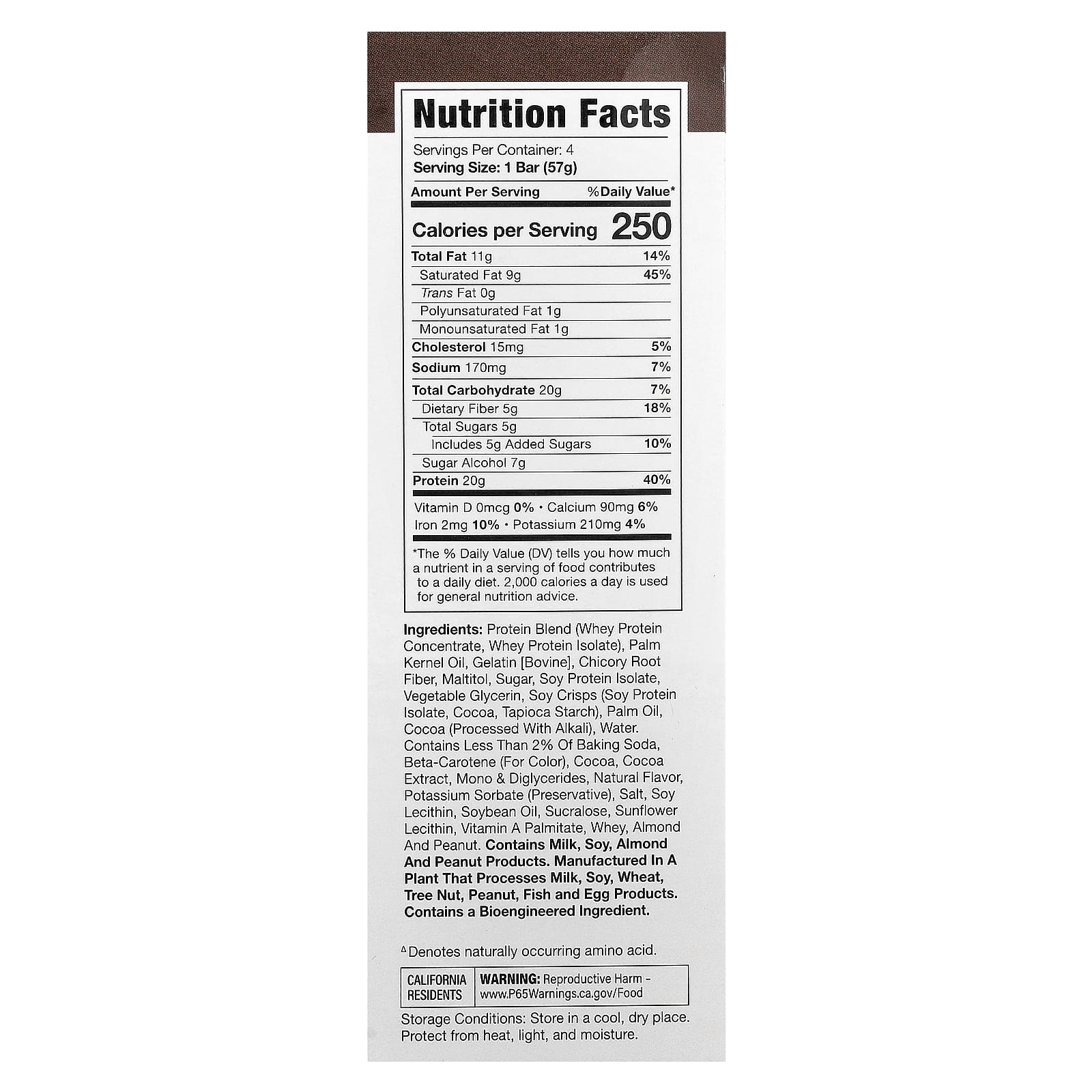 Mistura de proteínas (concentrado de proteína whey, isolado de whey protein), óleo de palmiste, gelatina [bovina], fibra da raiz de chicória, maltitol, açúcar, isolado proteico de soja, glicerina vegetal, flocos de soja (isolado proteico de soja, cacau, amido de tapioca), óleo de palma, cacau (processado com álcali), água. Contém menos de 2% de bicarbonato de sódio, betacaroteno (para dar cor), cacau, extrato de cacau, mono e diglicerídeos, sabor natural, sorbato de potássio (conservante), sal, lecitina de soja, óleo de soja, sucralose, lecitina de girassol, vitamina A (palmitato), whey, amêndoa e amendoim.