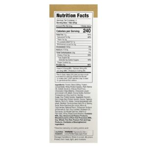 Mistura de proteínas (concentrado de proteína whey, isolado de whey protein), óleo de palmiste, gelatina [bovina], fibra da raiz de chicória, gotas de chocolate (maltitol, licor de chocolate [processado com álcali], manteiga de cacau, triestearato de sorbitano e lecitina de soja, baunilha), açúcar, isolado proteico de soja, glicerina vegetal, flocos de soja (isolado proteico de soja, cacau, amido de tapioca), óleo de palma, água, cacau (processado com álcali), maltitol. contém menos de 2% de bicarbonato de sódio, betacaroteno (para dar cor), mono e diglicerídeos, sabor natural, sorbato de potássio (conservante), sal, lecitina de soja, óleo de soja, sucralose, lecitina de girassol, vitamina A (palmitato), whey, amendoim e amêndoa.