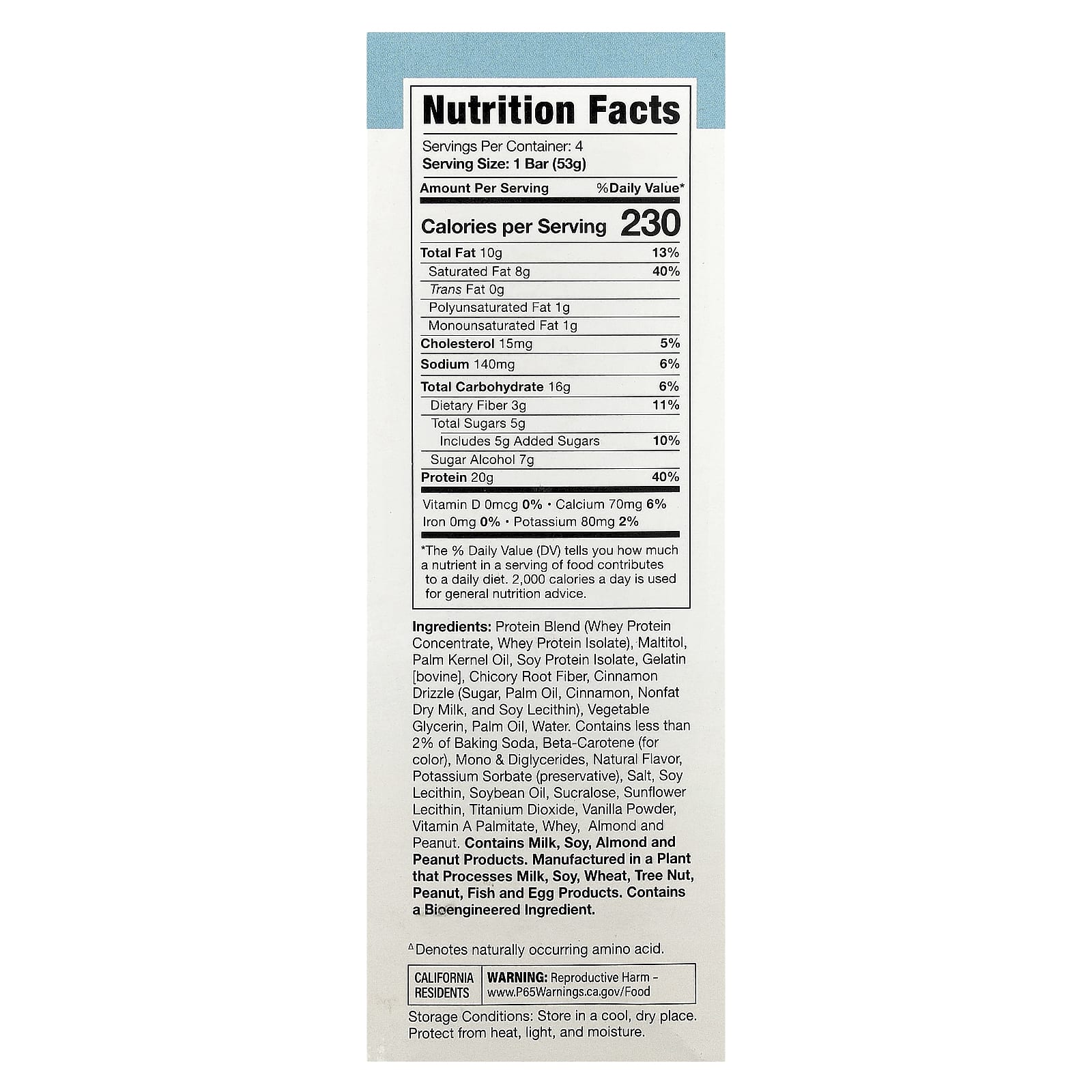 Mistura de proteínas (concentrado de proteína whey, isolado de whey protein), maltitol, óleo de palmiste, isolado proteico de soja, gelatina [bovina], fibra da raiz de chicória, gotas de canela (açúcar, óleo de palma, canela, leite desidratado sem gordura (desnatado), e lecitina de soja), glicerina vegetal, óleo de palma, água. contém menos de 2% de bicarbonato de sódio, betacaroteno (para dar cor), mono e diglicerídeos, sabor natural, sorbato de potássio (conservante), sal, lecitina de soja, óleo de soja, sucralose, lecitina de girassol, dióxido de titânio, baunilha em pó, vitamina A (palmitato), whey, amêndoa e amendoim.