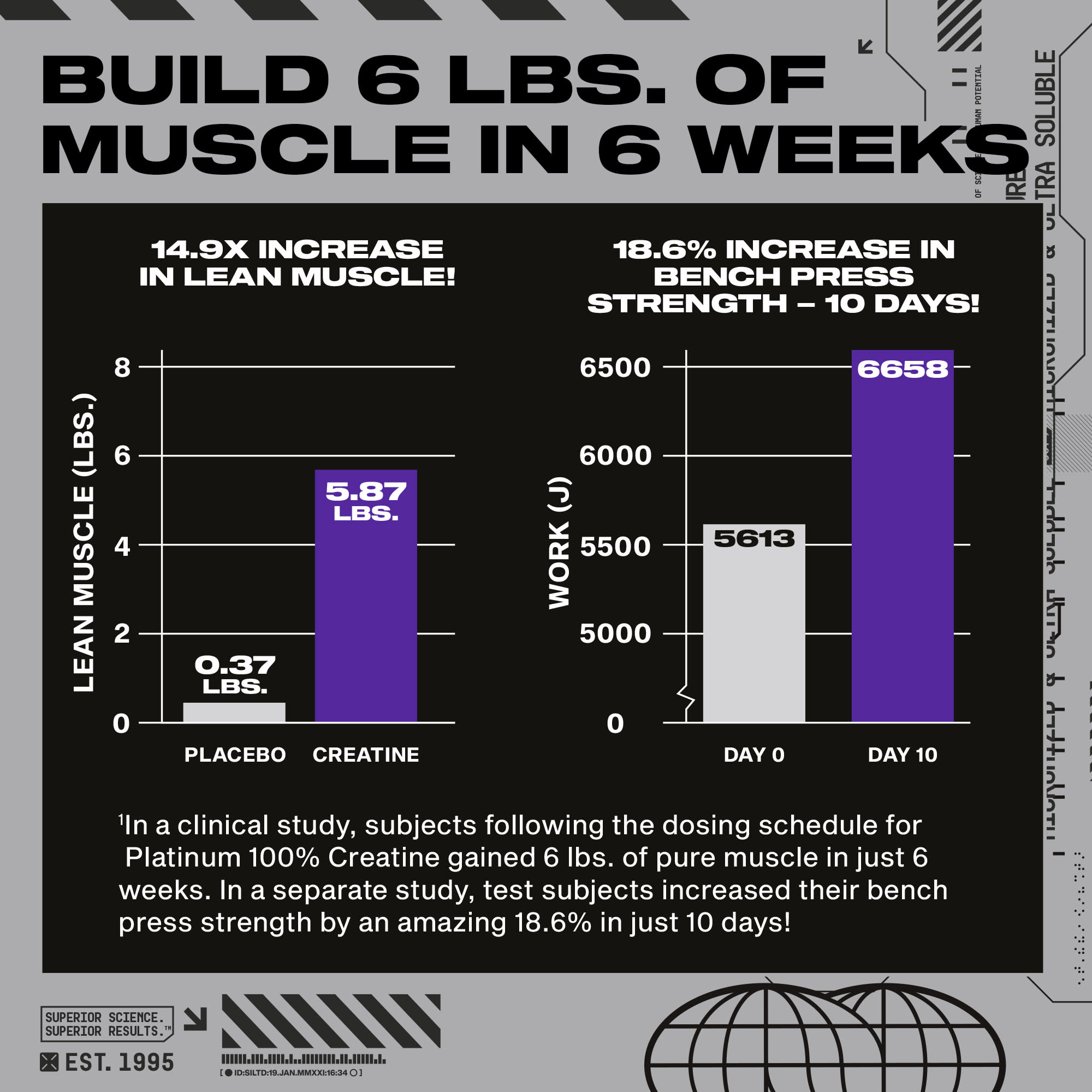 ¹Em um estudo clínico, os indivíduos que seguiram o programa de dosagem da Creatina Mono-hidratada 100% Platinum ganharam 6 lb de músculos em apenas 6 semanas. Em um estudo separado, os indivíduos que participaram do ensaio aumentaram sua força no supino em incríveis 18,6% em apenas 10 dias!
