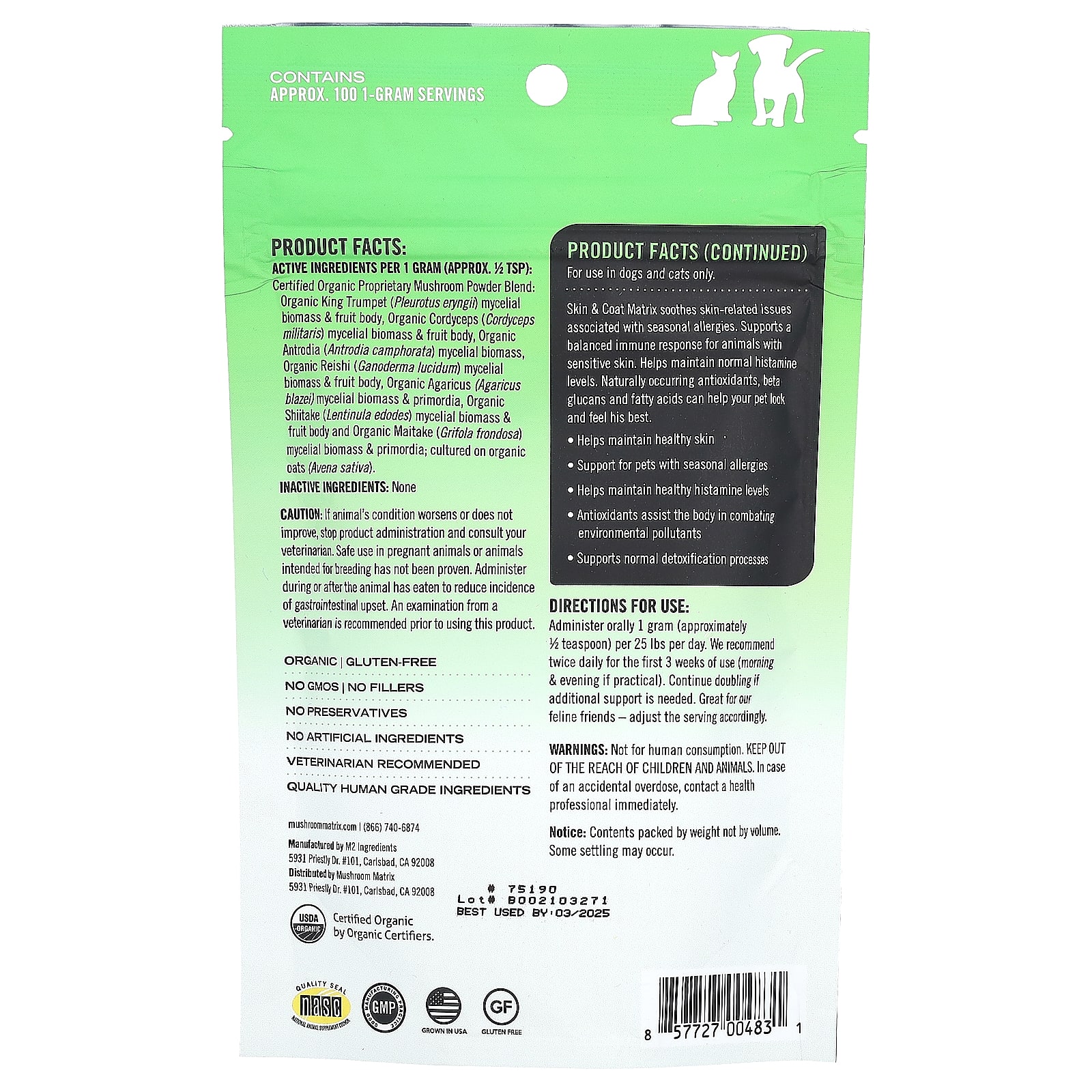 Mushroom Matrix Canine Skin e Pelos Pó de Cogumelo Orgânico Certificado Para Gatos e Cães Para Animais de Estimação 25 lb Para Cães e Gatos 100 g (35 oz)