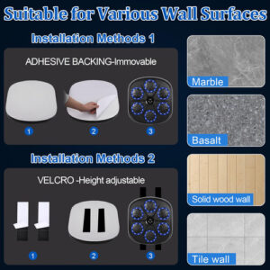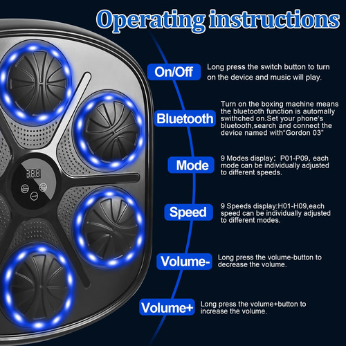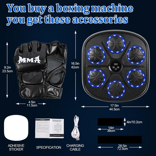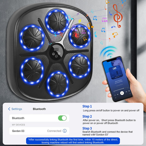 Máquina de boxe musical eletrônica LED para montagem na parede Máquina de caixa de música inteligente 9 modos e 9 velocidades A experiência real de boxe inclui luvas de boxe. Presente de máquina de boxe de parede para adultos e crianças – PAR GRATUITO DE LUVAS DE BOXE ALTAMENTE RESPIRÁVEIS. Quando você compra nossa máquina de boxe musical inteligente Hommkiety LED, ela vem com um par de luvas de boxe altamente respiráveis para homens e mulheres, não é necessário comprá-las separadamente, basta abri-las e usá-las, reduza suas despesas extras e mantenha suas mãos seguras! – DISPLAY LED E BLUETOOTH O display LED mostrará o número de acessos que você faz e registrará todos os seus progressos e crescimentos. A máquina de boxe musical inteligente para adultos suporta música bluetooth, você pode escolher suas músicas favoritas durante o treino de boxe. Alto-falantes circundantes e luzes frias mantêm você imerso em seu treinamento. É a ferramenta perfeita para treinamento profissional e exercícios diários, que pode ser usada por boxeadores profissionais, profissionais de fitness, adultos, crianças, etc. – MÁQUINA DE BOXE MUSICAL DE 9 MODOS E 9 VELOCIDADES A máquina de boxe musical Smart está equipada com 9 modos e 9 velocidades para atender às necessidades da maioria das pessoas. Quando o alvo do boxe se acende e você o atinge com o punho, você conta. A máquina de perfuração pode melhorar sua velocidade de reação e coordenação corporal. A máquina de boxe é o treinador profissional de boxe perfeito e a ferramenta de exercícios diários. Obtenha o equipamento de boxe perfeito e conveniente para se exercitar em casa! – Máquina de boxe robusta e segura. Máquina de boxe de música caseira Hommkiety, escolha premium! É feita de espuma de alto desempenho para garantir a recuperação e a absorção de choque, protegendo totalmente as mãos do usuário, e outras peças são feitas de material PU forte e durável, enquanto a configuração de absorção tripla de choque pode suportar exercícios profissionais de alta intensidade, oferecendo proteção de segurança total. – FÁCIL INSTALAÇÃO SEM PERFURAÇÃO. A máquina de música Boxing é montada na parede, usando fita dupla face e adesivos de velcro em todos os tipos de paredes, economizando espaço, sem necessidade de fazer furos na parede, pode ser ajustado de acordo com as preferências pessoais. Altura adequada para qualquer cena Este dispositivo de boxe é ideal para a sala de estar, quarto, garagem, academia ou clube de boxe