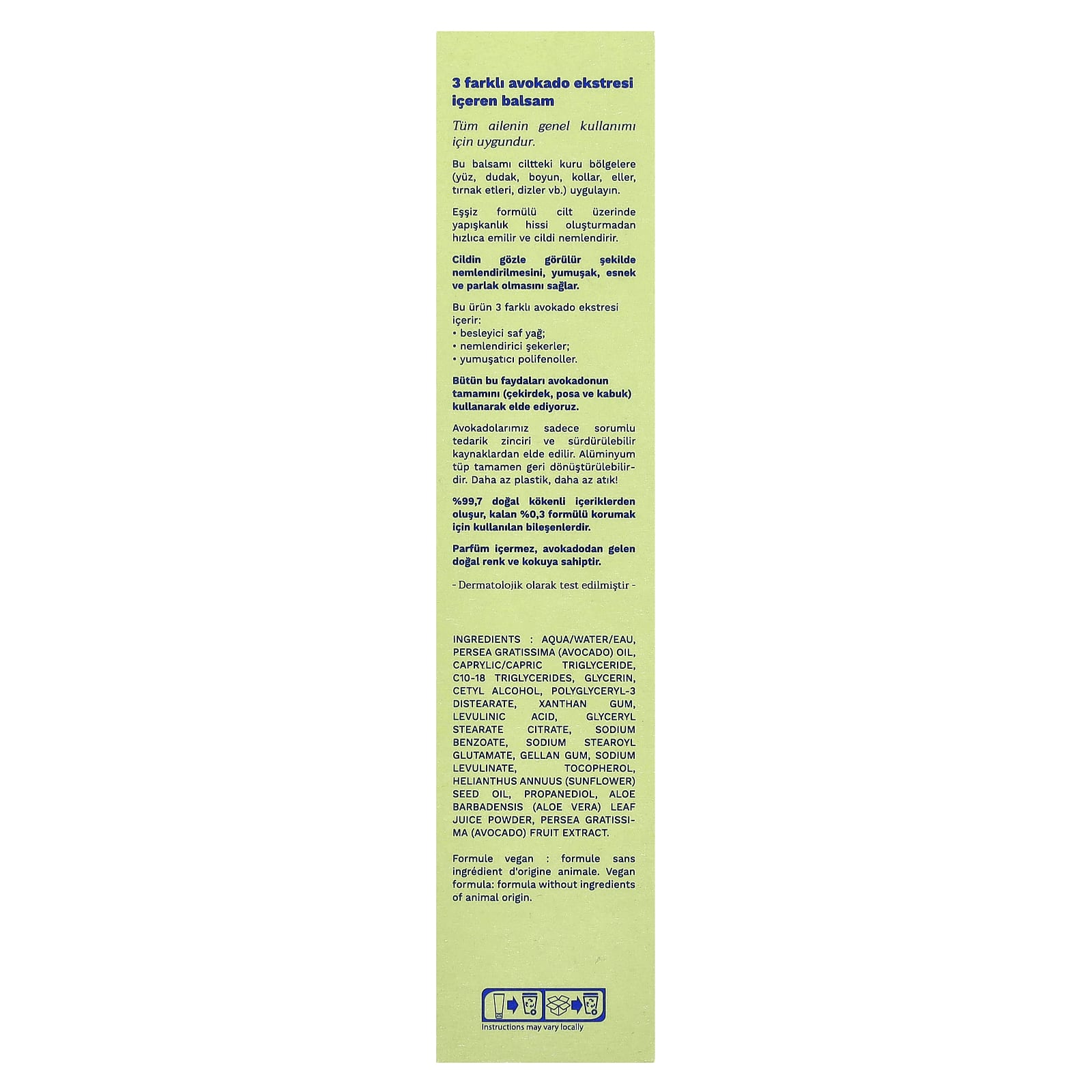 Água/aqua/eau, óleo de Persea gratissima (abacate), caprylic/capric triglyceride, triglicerídeos c10-18, glicerina, álcool cetílico, diestearato de poliglicerila-3, goma xantana, ácido levulínico, citrato de monoestearato de glicerila, benzoato de sódio, sodium stearoyl glutamate, goma gelana, levulinato de sódio, tocoferol, óleo da semente de Helianthus annuus (girassol), propanediol, pó do suco da folha de Aloe barbadensis (babosa), extrato da fruta de Persea gratissima (abacate).