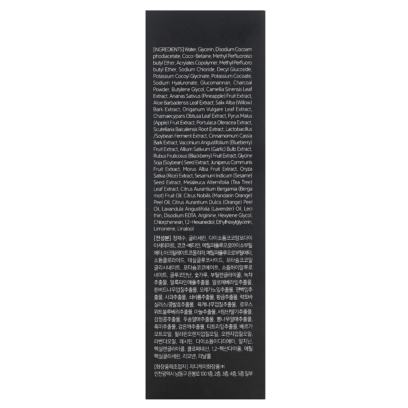 Água, glicerina, disodium cocoamphodiacetate, coco-betaine, éter metil perfluoroisobutil, acrylates copolymer, éter metil perfluorobutil, cloreto de sódio, decyl glucoside, potassium cocoyl glycinate, cocoato de potássio, hialuronato de sódio, glucomannan, pó de carvão vegetal, butilenoglicol, extrato da folha de Camellia sinensis, extrato da fruta de Ananas sativus (abacaxi), extrato da folha de Aloe barbadensis, extrato da casca de Salix alba (salgueiro), extrato da folha de Origanum vulgare, extrato da folha de Chamaecyparis obtusa, extrato da fruta de Pyrus malus (maçã), extrato de Portulaca oleracea, extrato da raiz de Scutellaria baicalensis, extrato de fermento de soja / lactobacilos, extrato da casca de Cinnamomum cassia, extrato da fruta de Vaccinium angustifolium (mirtilo), extrato do bulbo de Allium sativum (alho), extrato da fruta de Rubus fruticosus (amora), extrato da semente de Glycine soja (soja), extrato da fruta de Juniperus communis, extrato da fruta de Morus alba, extrato de Oryza sativa (arroz), extrato da semente de Sesamum indicum (gergelim), extrato da folha de Melaleuca alternifolia (melaleuca), óleo da fruta de Citrus aurantium bergamia (bergamota), óleo da casca de Citrus nobilis (mandarina), óleo da casca de Citrus aurantium dulcis (laranja), óleo de Lavandula angustifolia (lavanda), lecitina, edetato dissódico, arginina, hexylene glycol, clorfenesina, 1,2-hexanediol, ethylhexylglycerin, limoneno, linalol