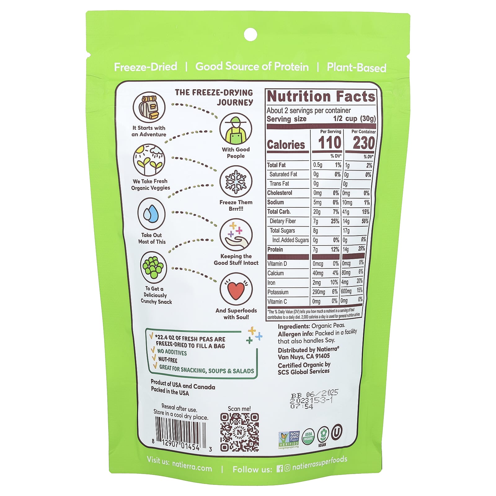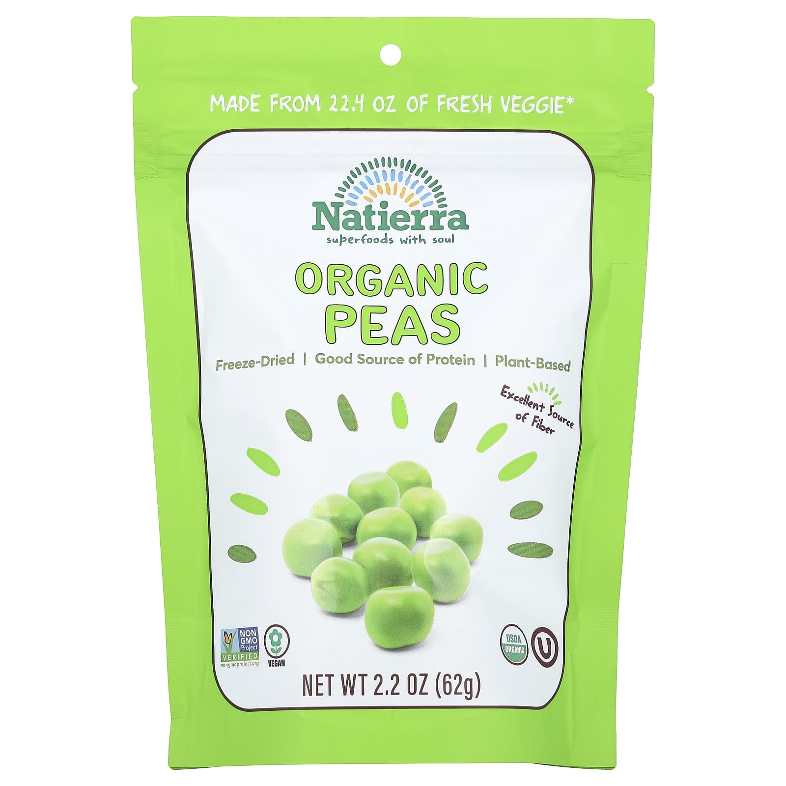 Natierra Liofilizado Orgânico Ervilhas 62 g (22 oz) – Natierra Alimentos Petiscos e lanches Snacks de frutas e vegetais Frutas e Legumes Secos.
