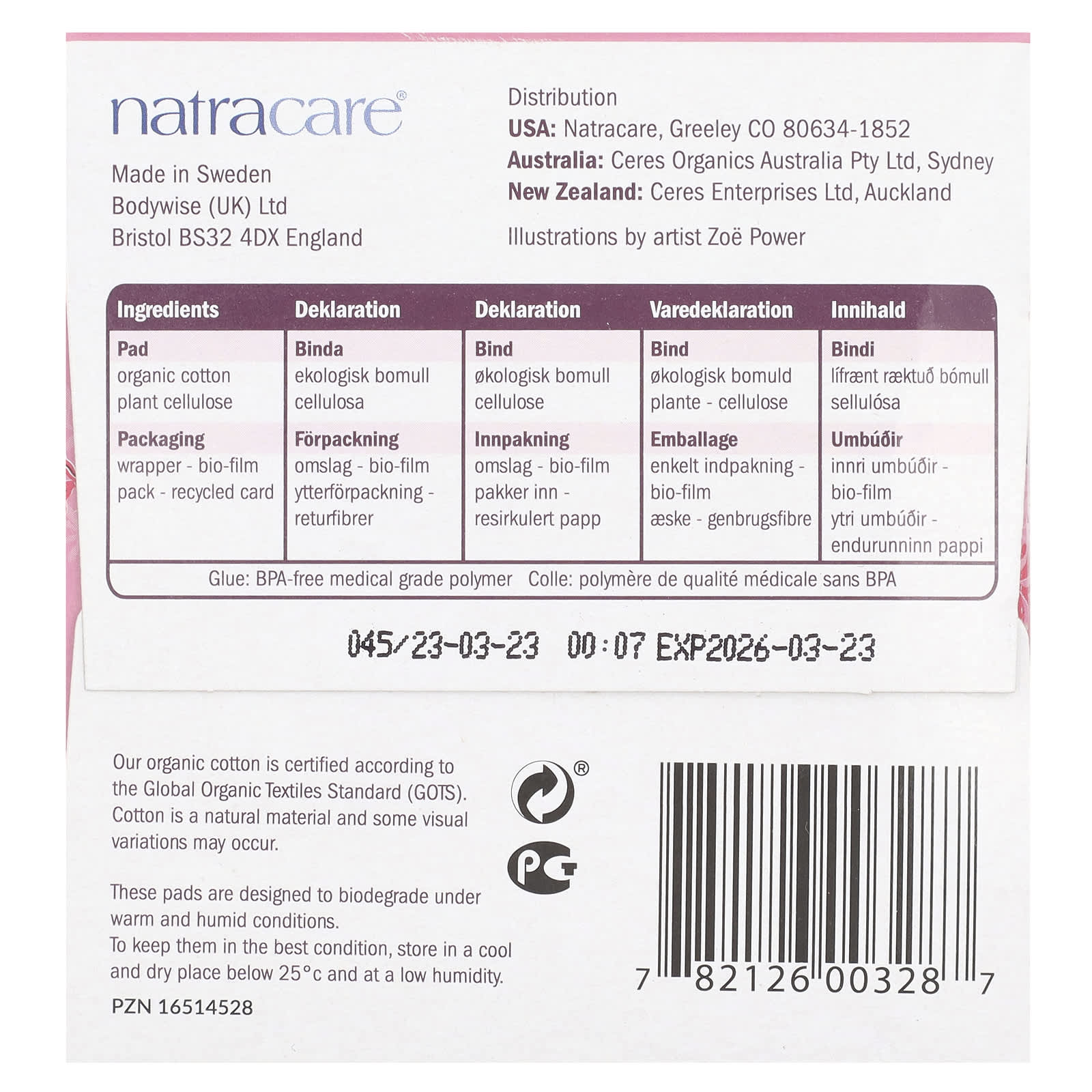 Absorvente: celulose de planta de algodão orgânico.