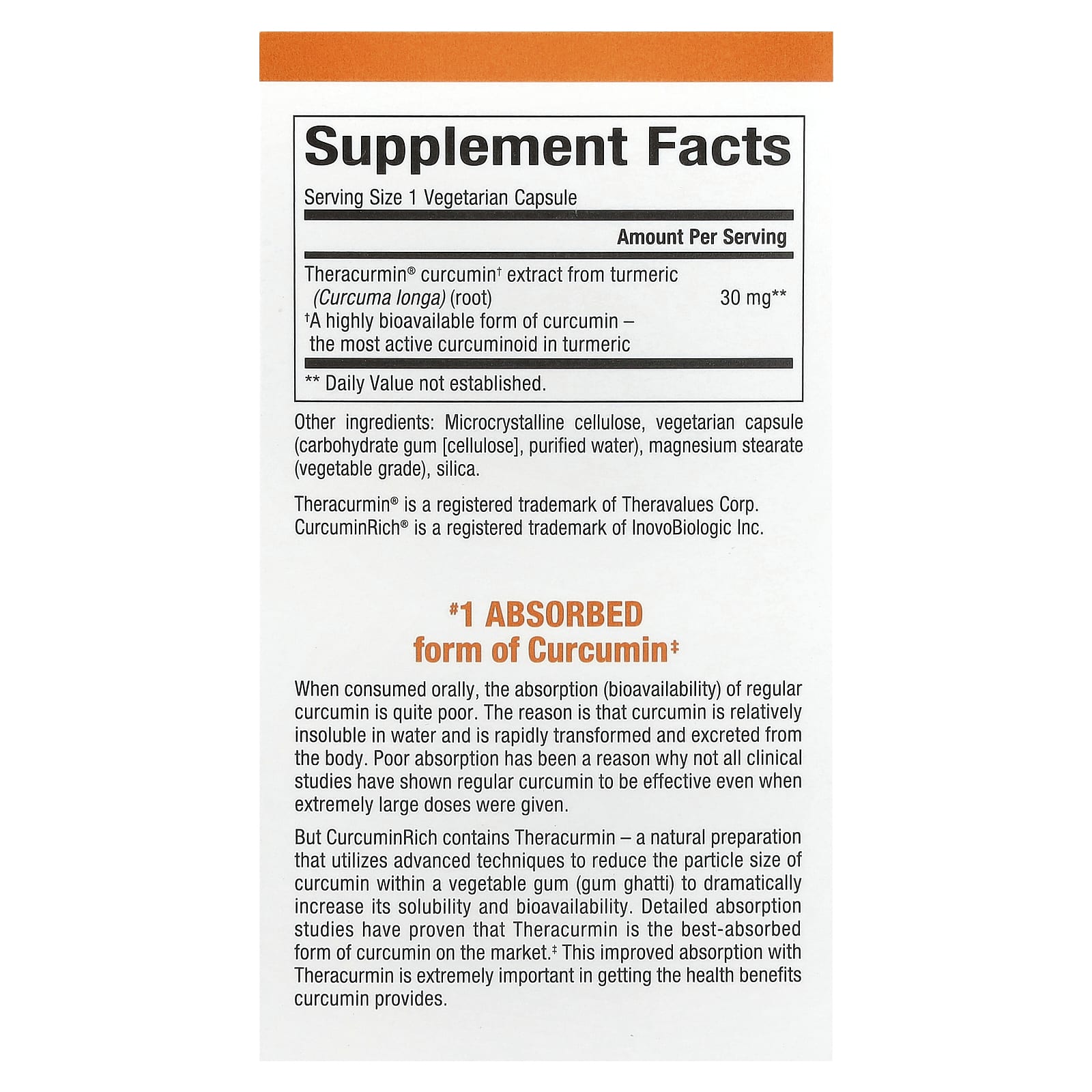 Mas CurcuminRich contém Theracurmin – uma preparação natural que utiliza técnicas avançadas para reduzir o tamanho das partículas de curcumina em uma goma vegetal (goma ghatti) para aumentar drasticamente sua solubilidade e biodisponibilidade. Estudos detalhados de absorção provaram que a Theracurmin é a forma de curcumina com melhor absorção do mercado. ‡ Esta absorção melhorada com o Theracurmin é extremamente importante para a obtenção dos benefícios para a saúde que a curcumina oferece.