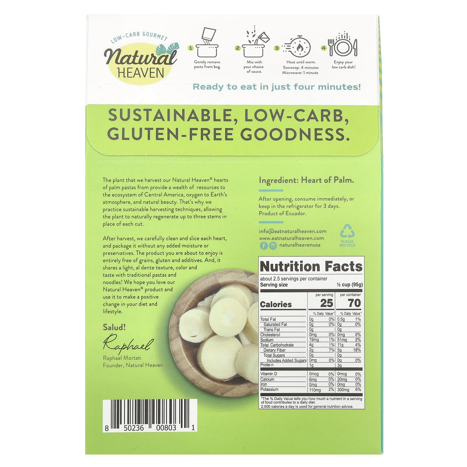 Após a colheita, limpamos e cortamos cuidadosamente cada coração e embalamos sem adição de umidade ou conservantes. O produto que você vai degustar é totalmente isento de grãos, glúten e aditivos. E compartilha textura, cor e sabor al dente com massas e noodles tradicionais! Esperamos que você ame nossoproduto Natural Heaven® e o use para fazer uma mudança positiva em sua dieta e estilo de vida.