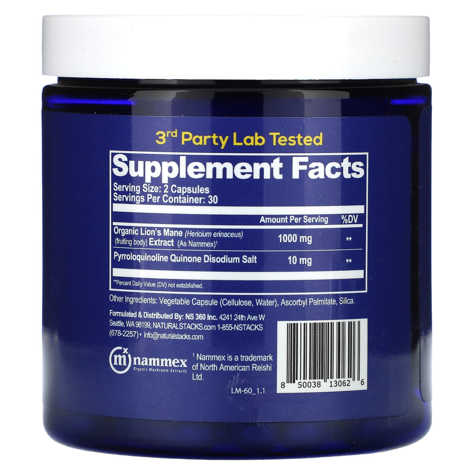 Natural Stacks Lions Mane + PQQ 60 Cápsulas Veganas – Natural Stacks Suplementos Cogumelos Juba de Leão.