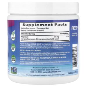 Natural vitality calm® é uma fórmula patenteada altamente absorvível de citrato de magnésio com pH equilibrado na forma iônica, sabor orgânico, extrato de estévia orgânica (folha).