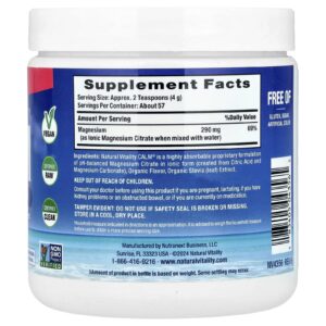 Calm® da Natural Vitality é uma fórmula patenteada altamente absorvível de Citrato de Magnésio com pH equilibrado na forma iônica (criada a partir do ácido cítrico e carbonato de magnésio), sabor orgânico, extrato de estévia orgânica (folha).