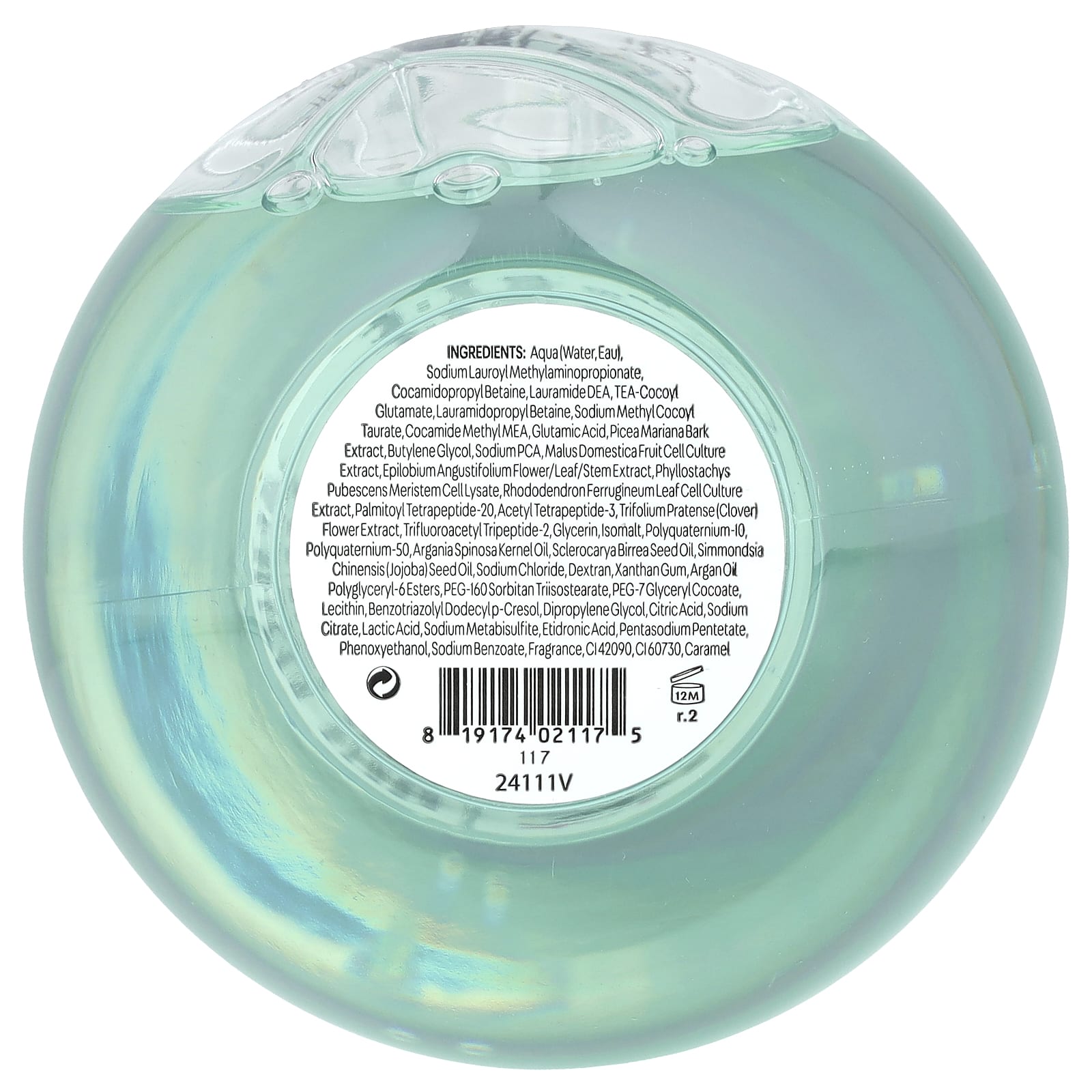 Aqua (água, eau), metilaminopropionato de lauroil sódico, cocoamidopropilbetaína, lauramide dea, chá-cocoil glutamato, lauramidopropilbetaína, sodium methyl cocoyl taurate, cocamida metil mea, ácido glutâmico, extrato da casca de Picea mariana, butilenoglicol, pidolato de sódio, extrato da cultura de células da fruta de Malus domestica, extrato de folha/flor/caule de Epilobium angustifolium, lisado de células de meristema de Phyllostachys pubescens, extrato da cultura de células da folha de Rhododendron ferrugineum, palmitoyl tetrapeptide-20,acetyl tetrapeptide-3, extrato da flor de Trifolium pratense (trevo), tripeptídeo-2 de trifluoroacetil, glicerina, isomalte, poliquatérnio-10, poliquatérnio-50, óleo do grão de Argania spinosa, óleo da semente de Sclerocarya birrea, óleo da semente de Simmondsia chinensis (jojoba), cloreto de sódio, dextrano, goma xantana, ésteres de polyglyceryl-6 de óleo de argão, triisostearate de sorbitano peg-160, peg-7 glyceryl cocoate, lecitina, benzotriazolyl dodecylp-cresol, dipropilenoglicol, ácido cítrico, citrato de sódio, ácido láctico, metabissulfito de sódio, ácido etidrônico, fenoxietanol, pentetato de pentassódio, benzoato de sódio, fragrância, CI 42090, CI60730, caramelo.