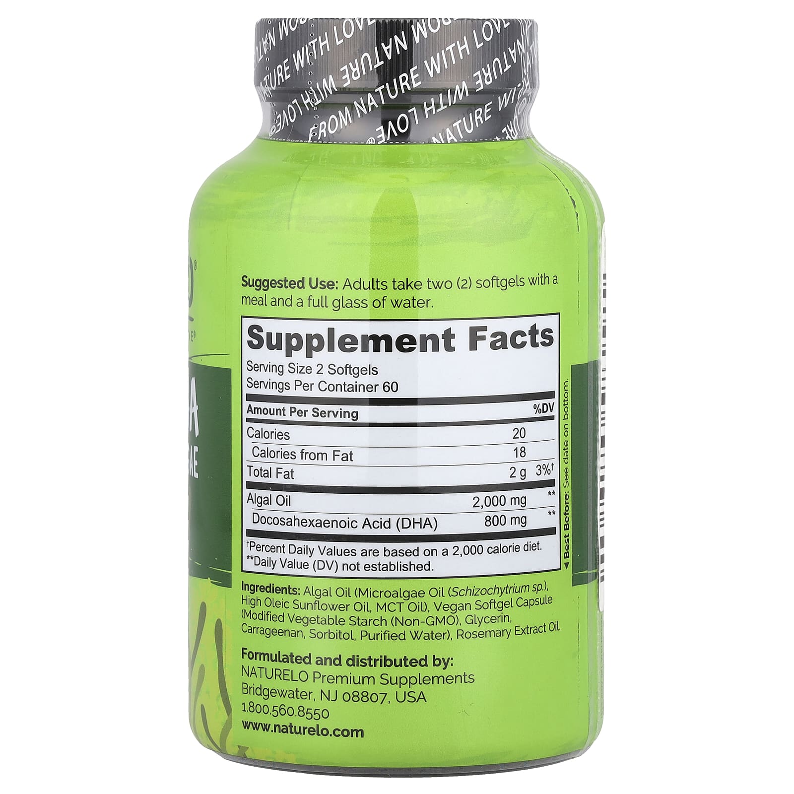 NATURELO DHA Vegano Ômega-3 de Algas 120 Cápsulas Softgel Veganas (400 mg por Cápsula Softgel) – NATURELO Suplementos Ômegas e Óleos de Peixe (EPA/DHA) DHA.