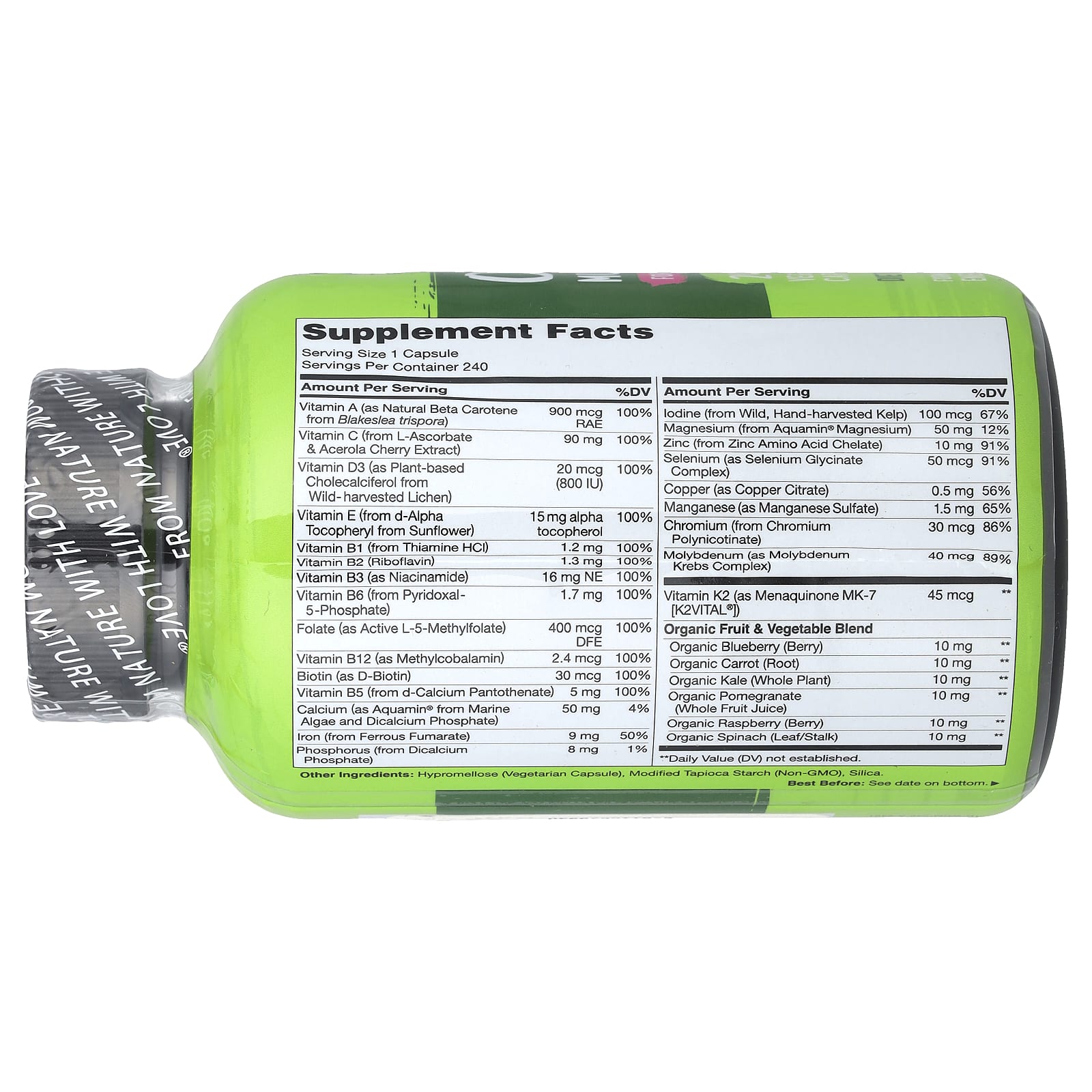 À base de plantas: Com vitaminas e minerais premium à base de plantas, como Vitamina D3 de líquen, Vitamina E de girassol, Cálcio e Magnésio de algas marinhas e Iodo de algas marinhas.