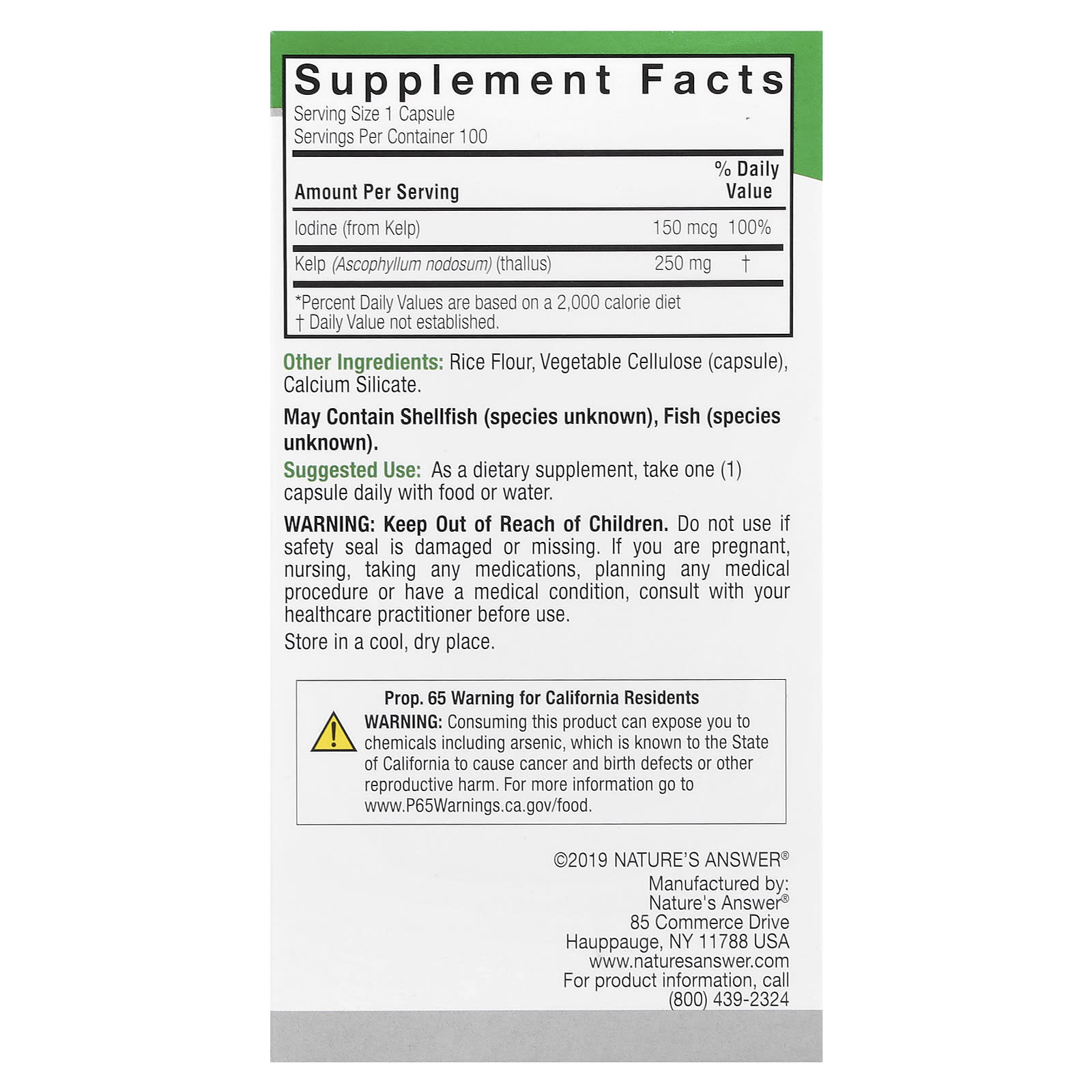 Natures Answer Kelp Thallus 100 Cápsulas Vegetais (250 mg por Cápsula)