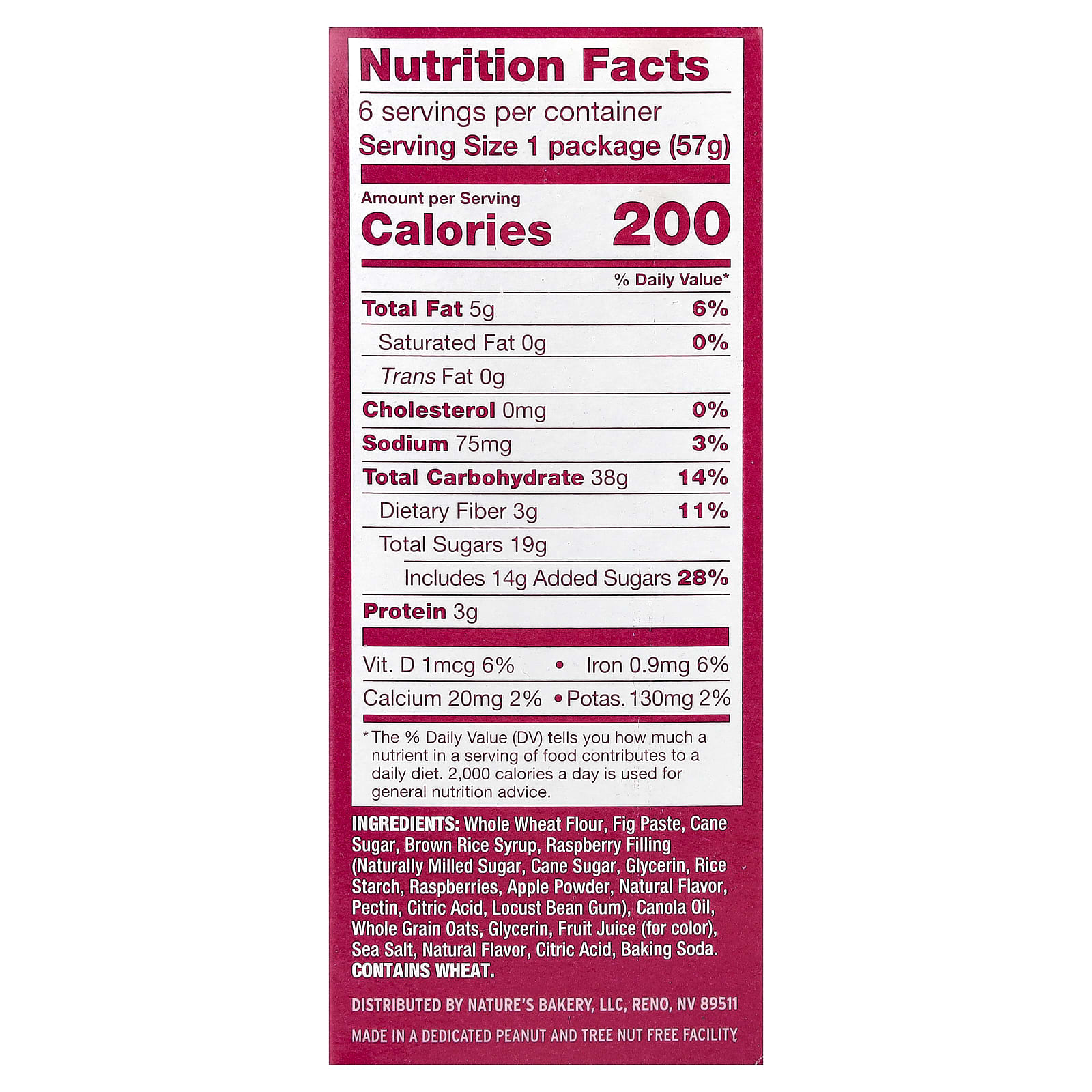 Farinha de trigo integral, pasta de figo, açúcar de cana-de-açúcar, xarope de arroz integral, recheio de framboesa (açúcar moído naturalmente, açúcar de cana-de-açúcar, glicerina, amido de arroz, framboesas, maçã em pó, sabor natural, pectina, ácido cítrico, goma de alfarroba), óleo de canola, grãos de aveia integrais, glicerina, suco de frutas (corante), sal marinho, sabor natural, ácido cítrico, bicarbonato de sódio.