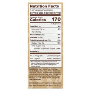 Farinha de trigo integral, açúcar de cana-de-açúcar, óleo de canola, pasta de tâmara, cacau em pó (processado com álcali), glicerina, xarope de arroz integral, chocolate (chocolate sem açúcar, açúcar de cana-de-açúcar, manteiga de cacau, cacau em pó), goma de acácia, farinha de cevada maltada, melaço, sal marinho, sabores naturais, bicarbonato de sódio.