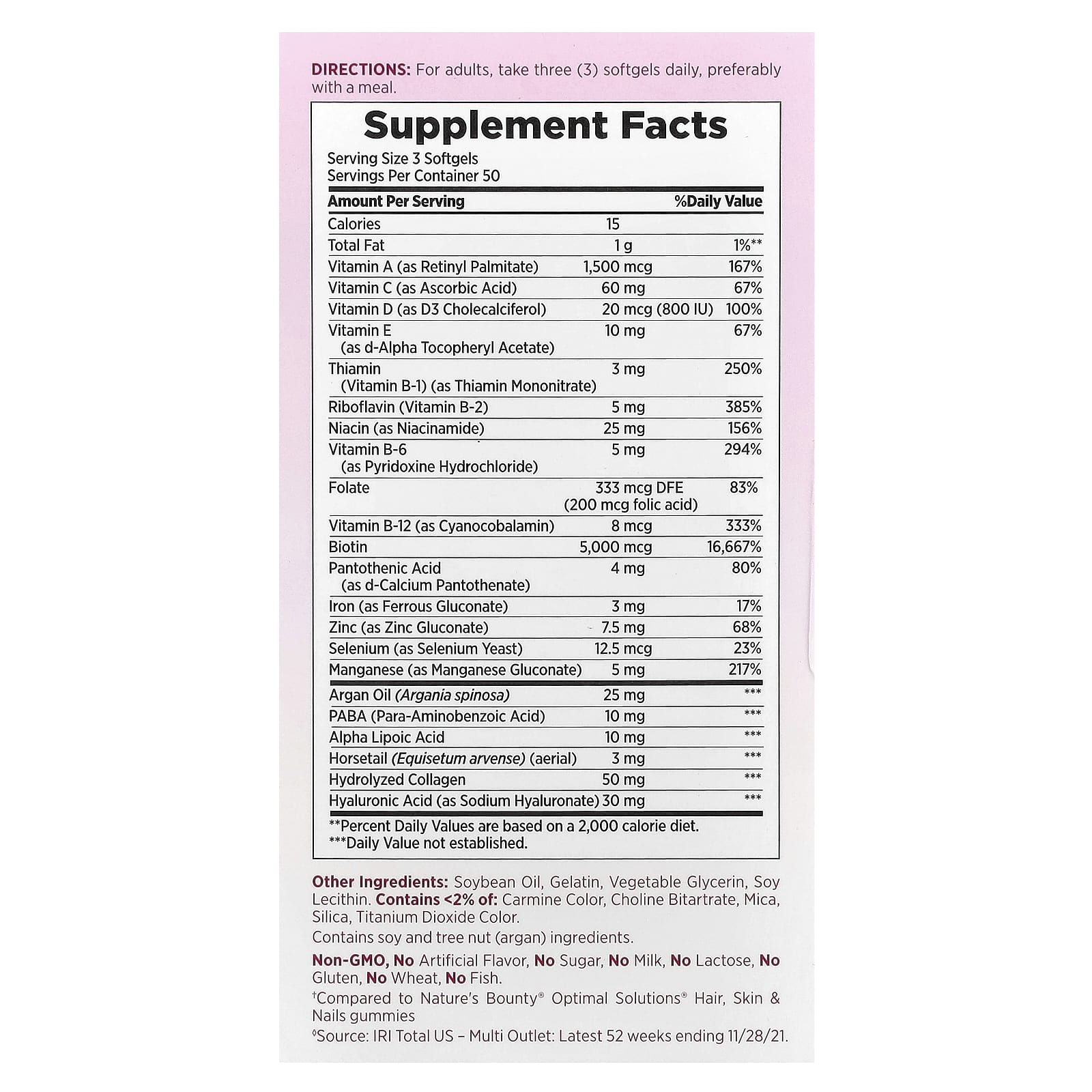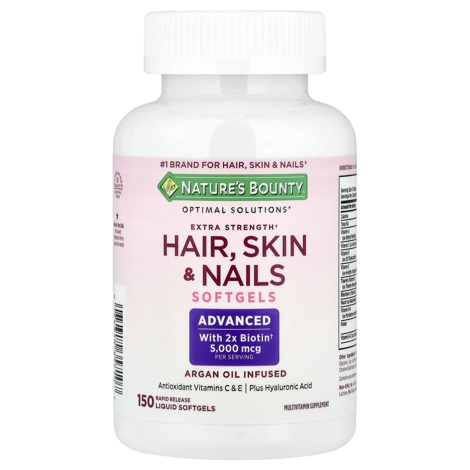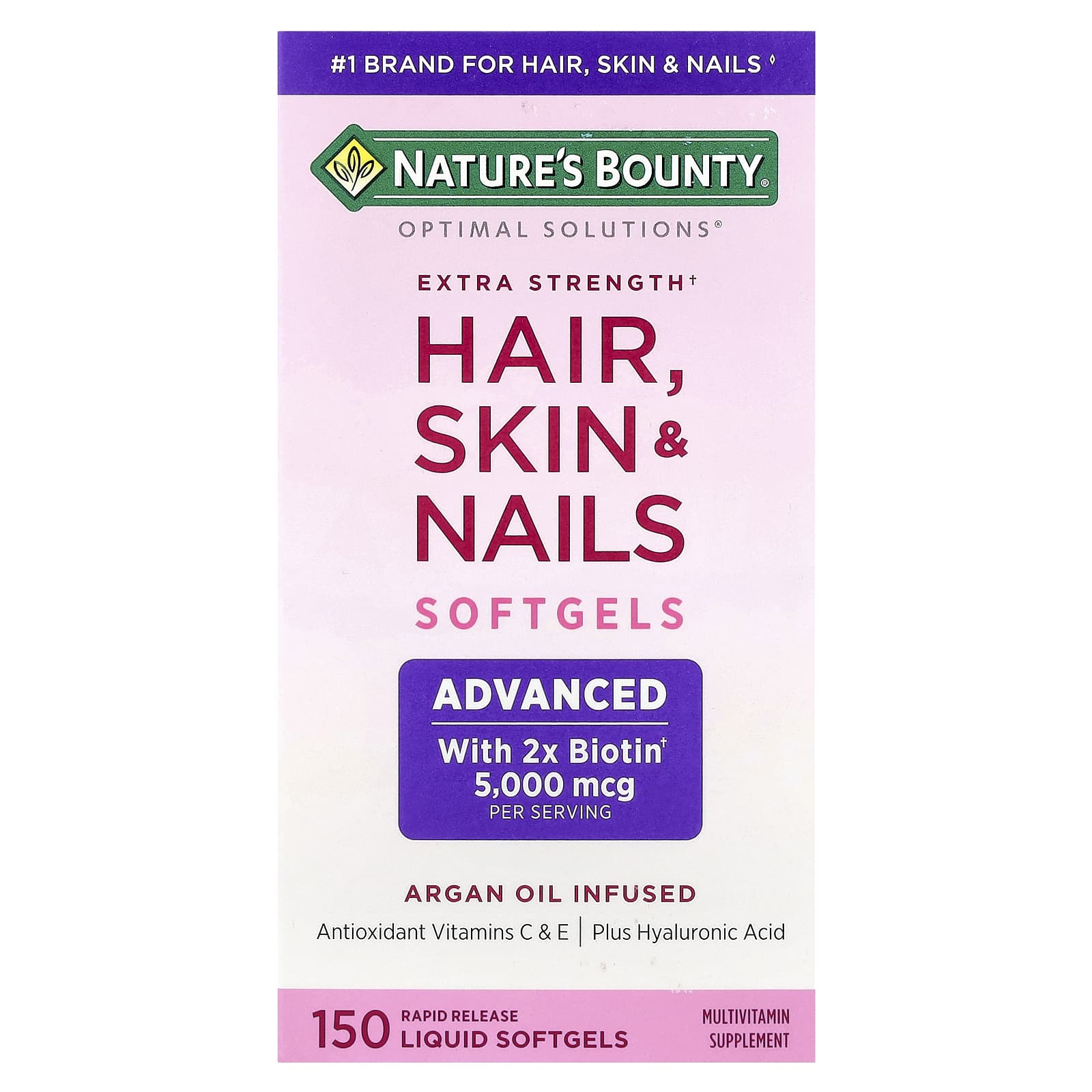 Ser saudável é sempre lindo. Com a fórmula de Potência Extra† para Cabelos, Pele e Unhas da Nature’s Bounty® Optimal Solutions®, contendo Óleo de Argão, você ficará linda e se sentirá ótima! Ela contém o equilíbrio perfeito de nutrientes para manter cabelos bonitos, unhas saudáveis e uma pele brilhante.