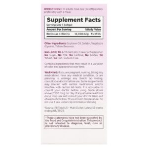 A Biotina de 10.000 mcg da Nature’s Bounty® Optimal Solutions® pode se tornar parte de qualquer rotina de beleza para ajudar você a se sentir bonita. A biotina ajuda a manter a saúde do cabelo, da pele e das unhas para que você possa se sentir e se sentir melhor. A Biotina, uma Vitamina B, auxilia na conversão dos alimentos em energia celular para ajudar você a enfrentar o dia !* Ser saudável pode fazer você se sentir radiante e bonito por dentro e por fora.