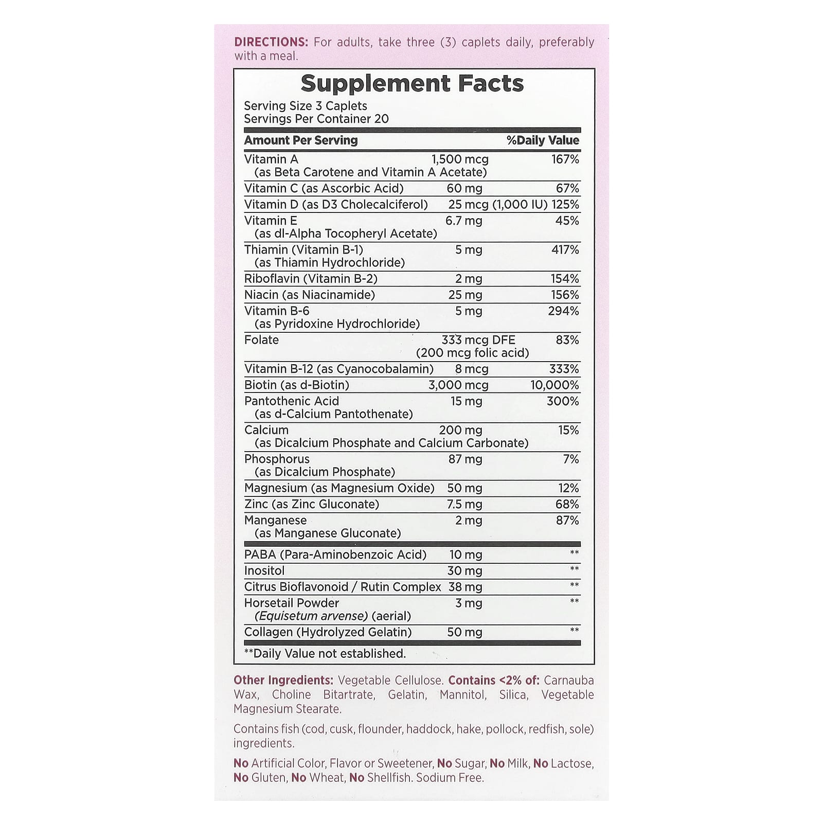 Esta fórmula inovadora fornece os nutrientes vitais de que seu corpo precisa, ajudando você a exibir sua beleza natural de dentro para fora. As Vitaminas B ajudam no metabolismo energético e a Biotina ajuda a manter os cabelos e as unhas saudáveis. As Vitaminas E e C são antioxidantes. A Vitamina C está envolvida na produção e formação de colágeno, que constitui a base para uma pele vibrante. A Vitamina A auxilia na manutenção da pele e na saúde geral.