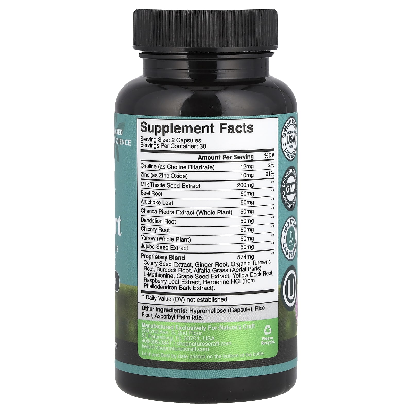 | Proprietary Blend Celery Seed Extract, Ginger Root, Organic Turmeric Root, Burdock Root, Alfalfa Grass (Aerial Parts), L-Methionine, Grape Seed Extract, Yellow Dock Root, Raspberry Leaf Extract, Berberine HCI (from Phellodendron Bark Extract). |