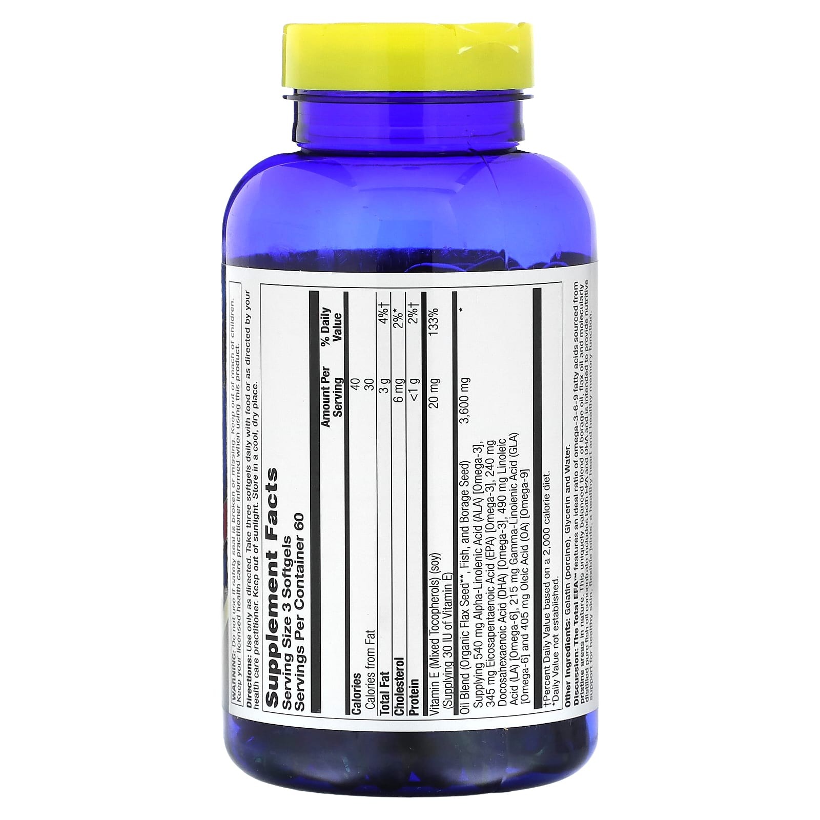 Análise: O Total EFA ™ apresenta uma proporção ideal de ácidos graxos ômega-3-6-9 provenientes de áreas intocadas da natureza. Esta mistura equilibrada de óleo de borragem, óleo de linhaça e concentrado de óleo de peixe puro destilado molecularmente inclui EPA e DHA e se destina a fornecer suporte nutritivo para pele saudável, articulações flexíveis, coração saudável e função de memória saudável.