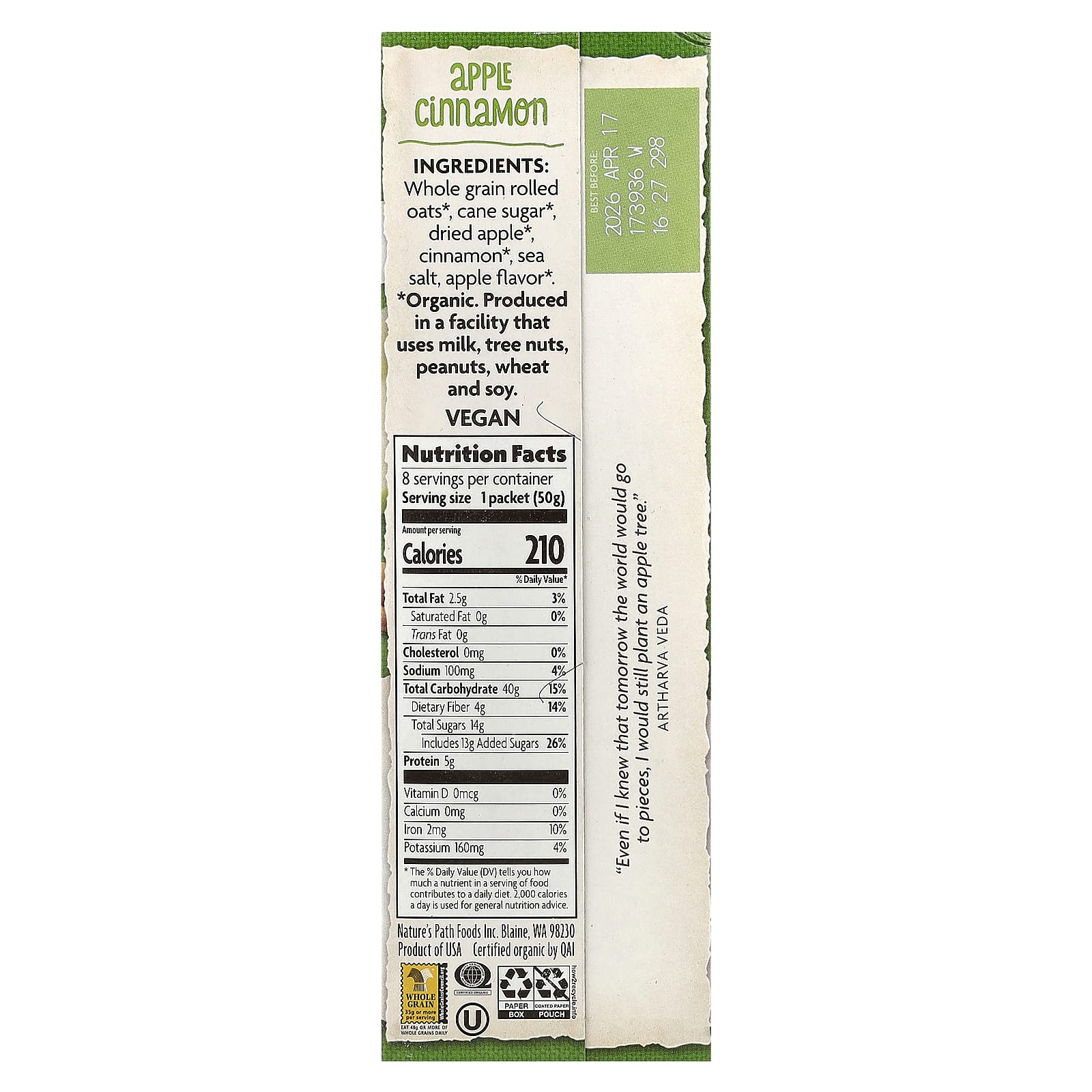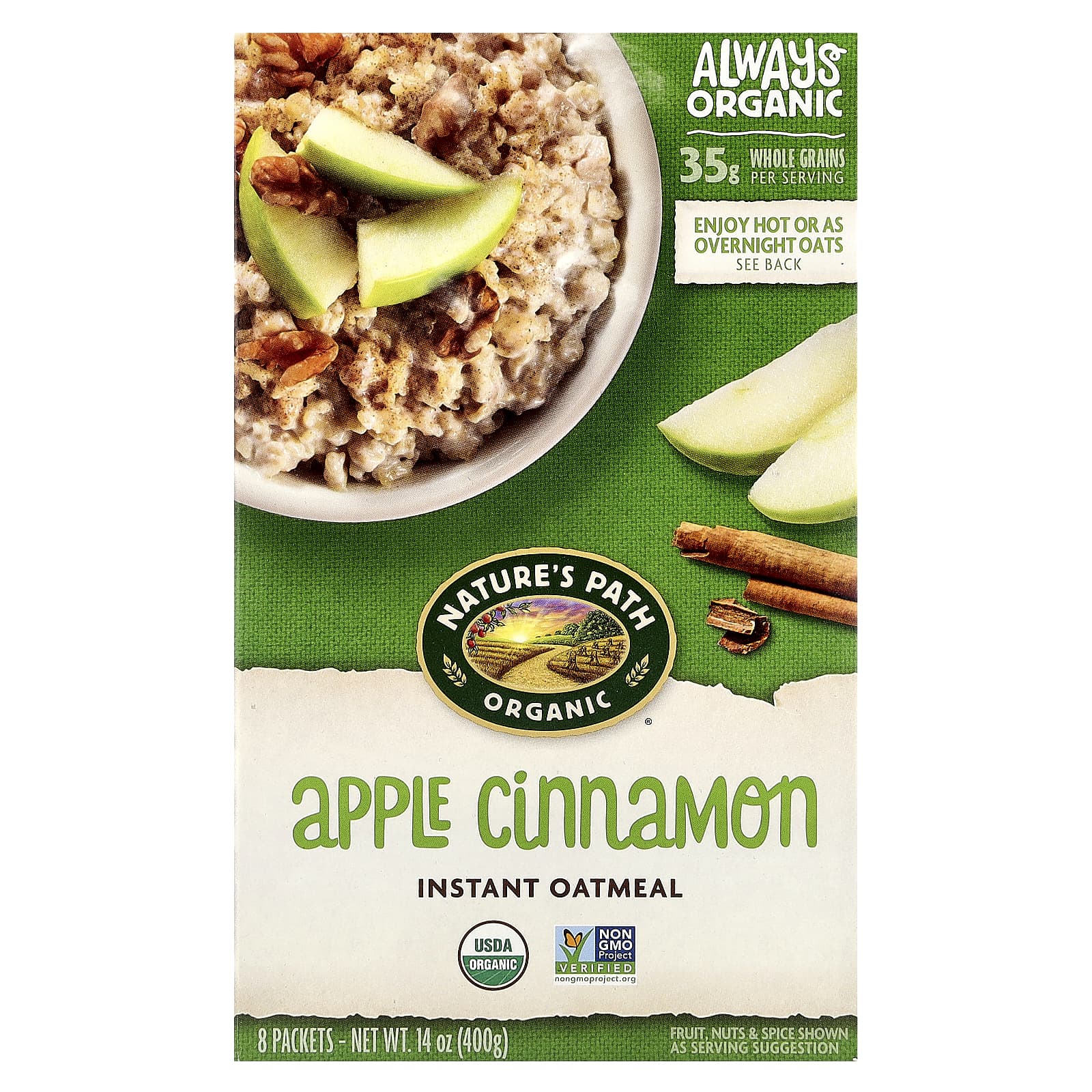 Natures Path Aveia Instantânea Orgânica Canela de Maçã 8 Pacotes 400 g (14 oz) – Nature’s Path Alimentos Cereais e alimentos para café da manhã Aveia Cereais quentes.