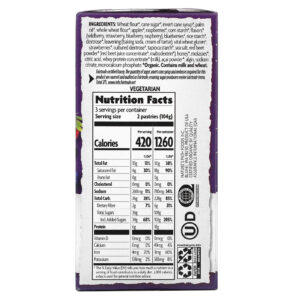Farinha de trigo *, açúcar de cana*, xarope de cana invertido *, óleo de palma *, farinha de trigo integral*, maçãs *, framboesas *, amido de milho *, sabores * (amora silvestre, morango, mirtilo, framboesa), mirtilos *, amido de arroz*, dextrose *, fermentação (bicarbonato de sódio, creme de tártaro), glúten de trigo vital *, morangos *, dextrose em cultura *, amido de tapioca*, sal marinho, beterraba vermelha em pó * (suco concentrado de beterraba vermelha *, romã*), mel *, melaço*, ácido cítrico, concentrado de proteína whey * (leite), açaí em pó*, algina, citrato de sódio, fosfato de monocálcio. * Orgânico