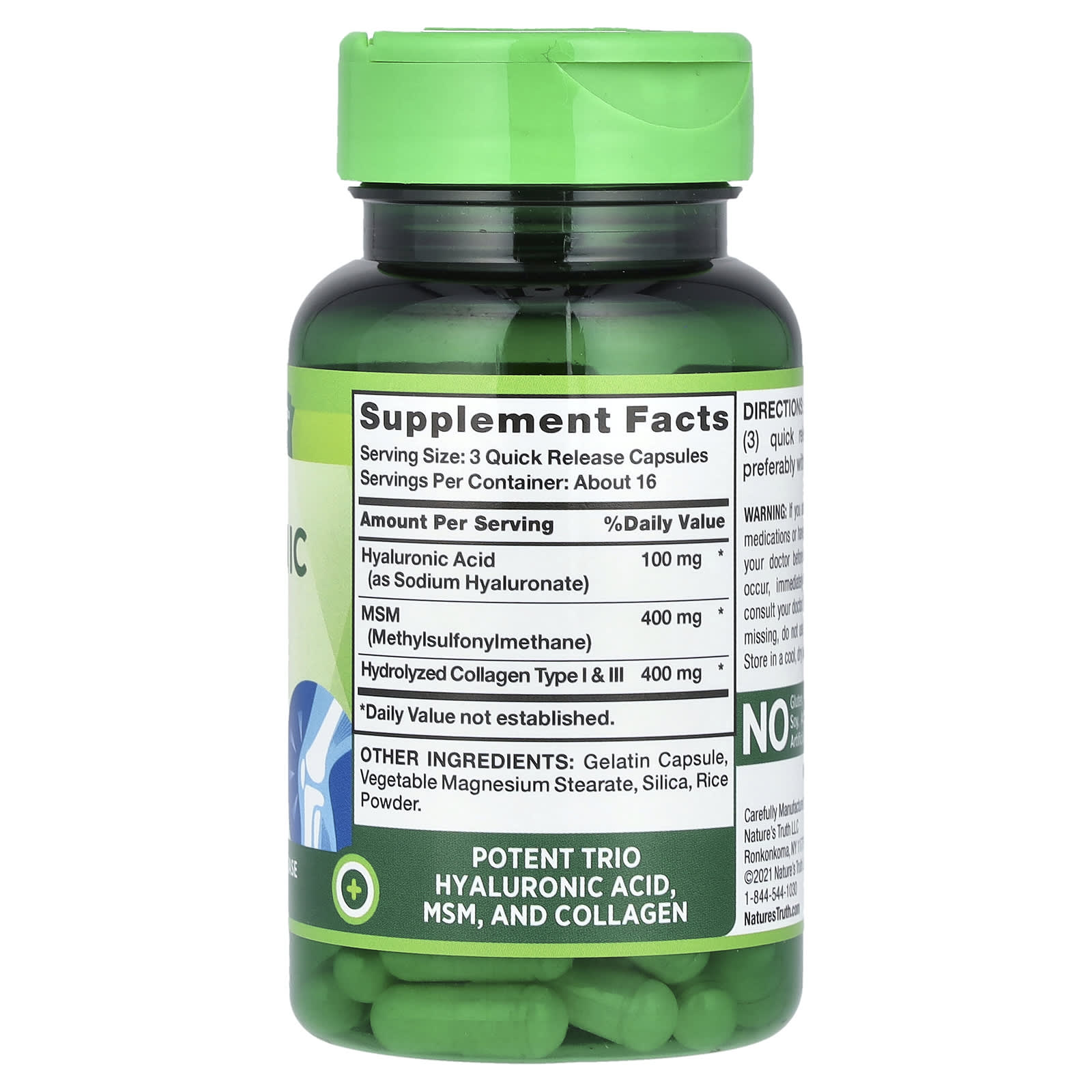 Potente trio ácido hialurônico, MSM e colágeno.