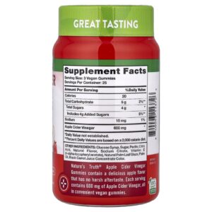 As Gomas de Vinagre de Sidra de Maçã da Nature’s Truth® contêm um delicioso sabor natural de maçã que não deixa um gosto residual desagradável. Cada porção contém 600 mg de Vinagre de Maçã, tudo em gomas veganas práticas.